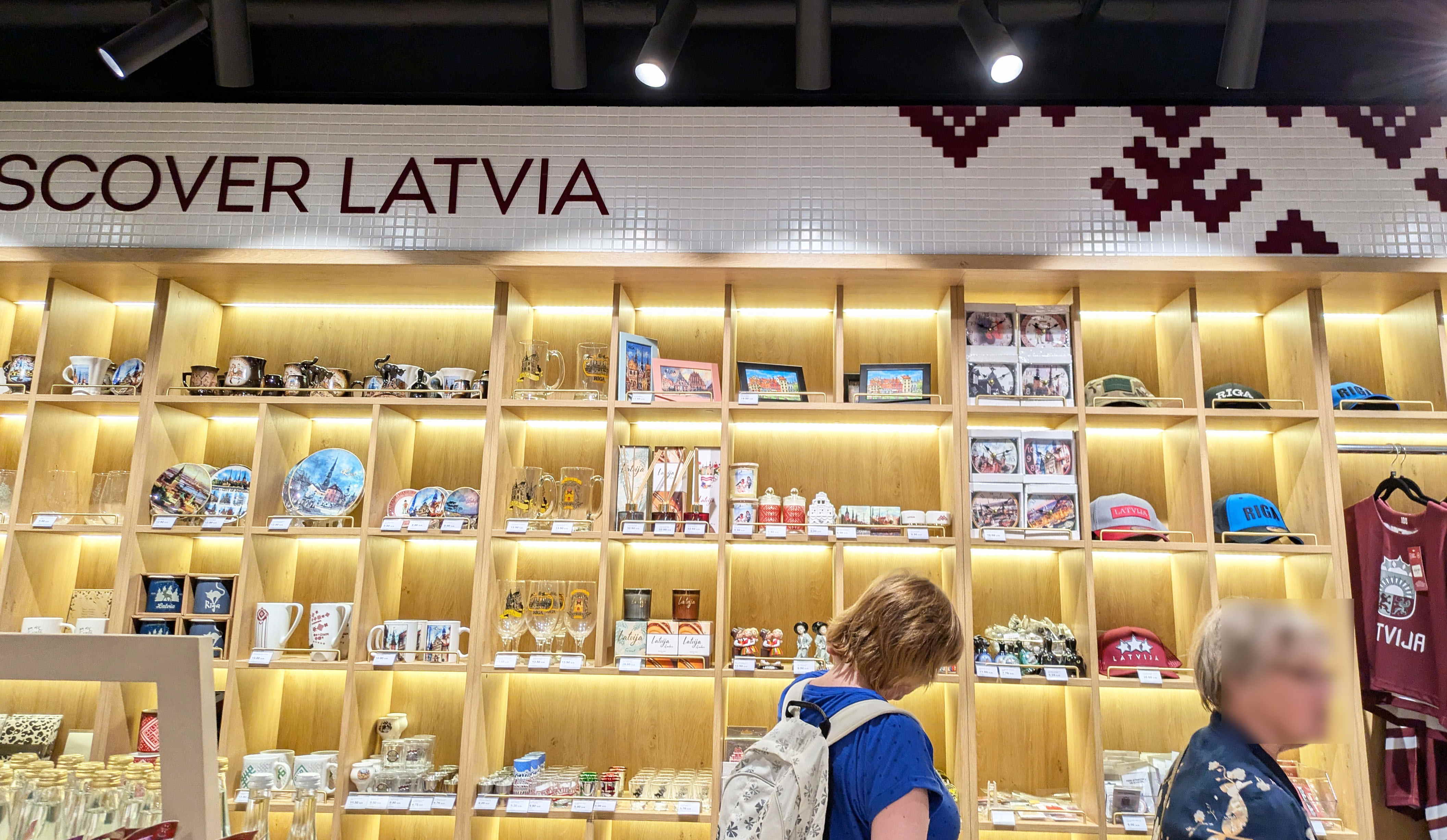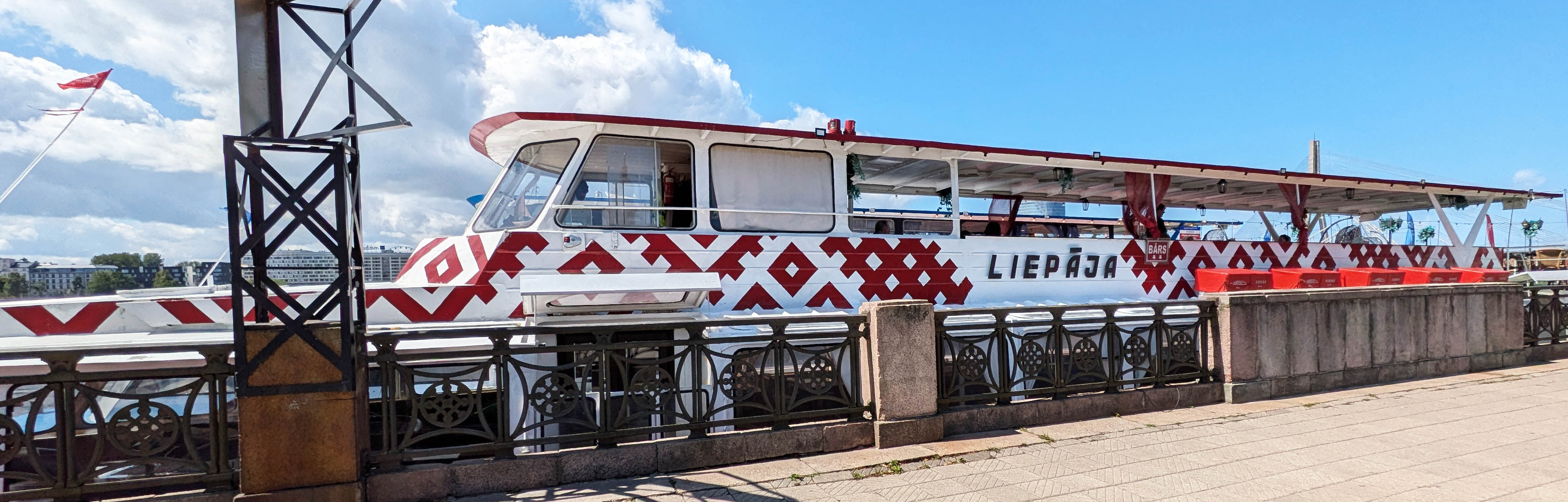 私が「ラトヴィアのシンボルマークの一つ」と言ったものや、それに近いをデザインを使ったものは、衣類以外にも見られました。ダウガバ川の遊覧船の外壁のデザインや、リガ空港免税店で売っていたマグカップのデザインなどです。1回だけ、街中を走っている市電の外壁がこの船のようになっているものに出くわし、感動して撮ろうとしたところ、カメラを取り出すのにもたもたして、残念ながらシャッターチャンスを逃してしまいました。リガ滞在の終わりのころでしたので、二度とお目にかかれませんでした。