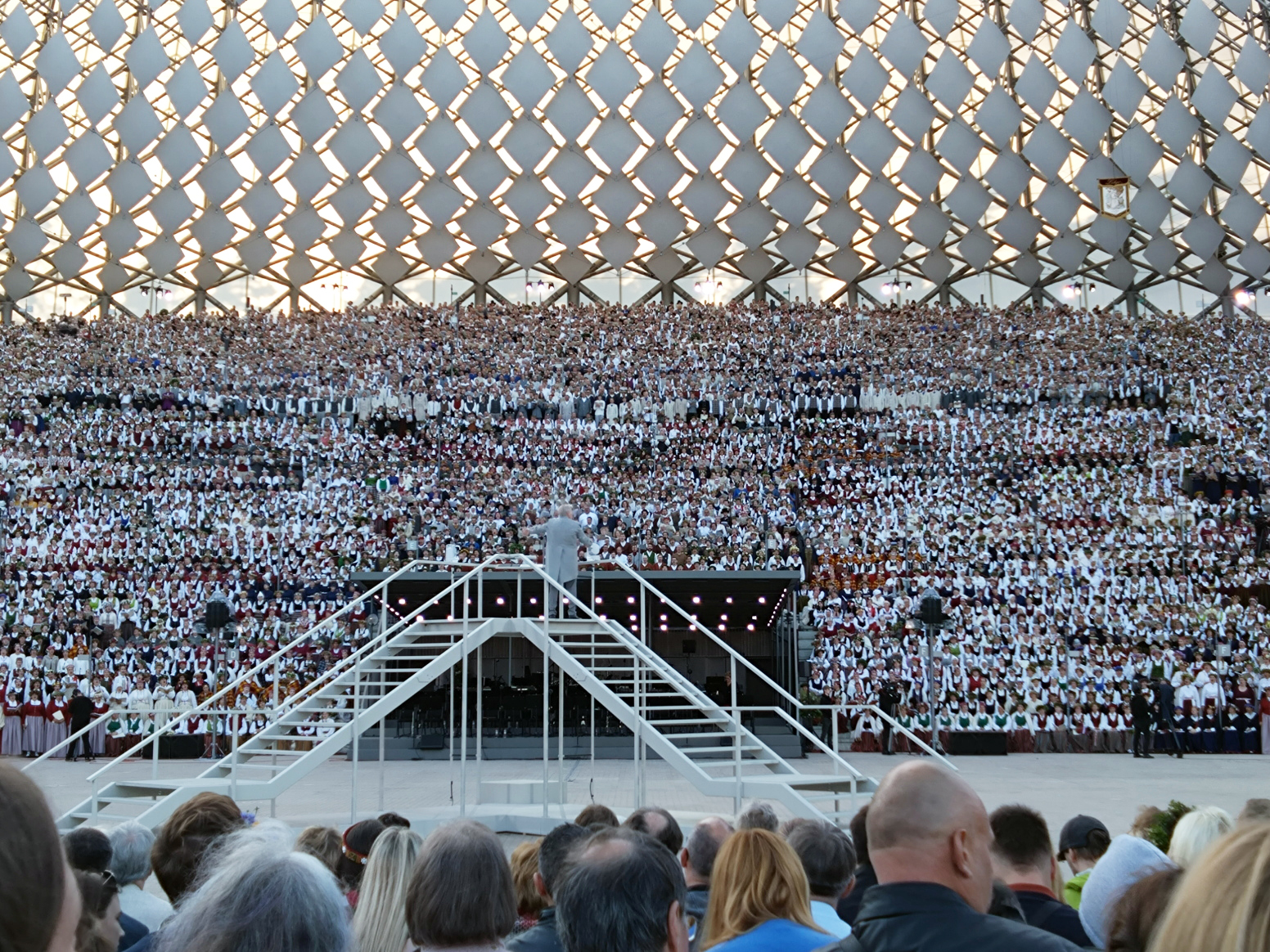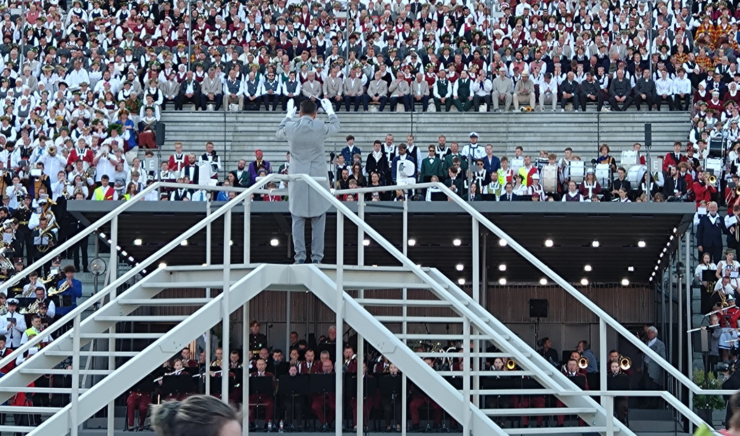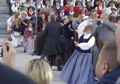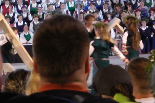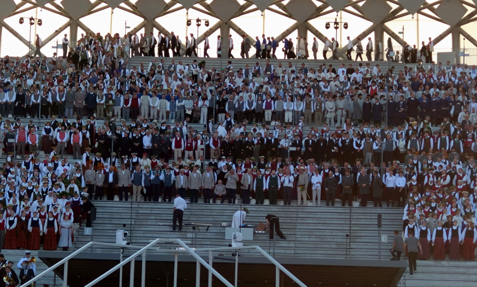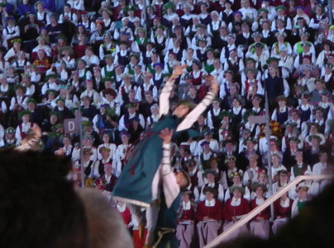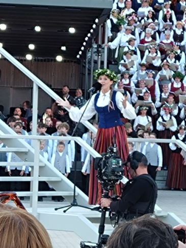 開会式らしきものは無かったようで、いよいよ合唱が始まったが、合唱の在り方について4年前のエストニアのものとの違いを感じた。エストニアでは、合唱団が曲ごとに出退場して入れ替わったのだが、このラトビアのものでは、歌う人々は入れ替わらず、自分の歌う曲が来た時その場に立ち上がって歌い、これを繰り返した。だから合唱団の出退場の時間的ロスが無くどんどん進行した。ソロで歌う歌手はステージと観客席の間の広いスペースに設けられた指揮台の脇または特設の壇上で歌った。