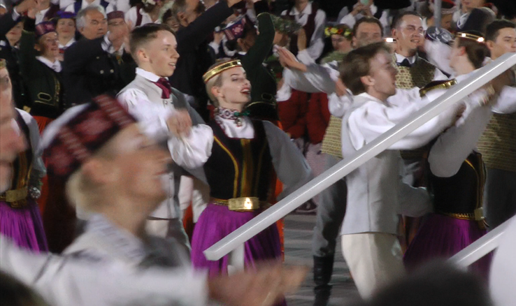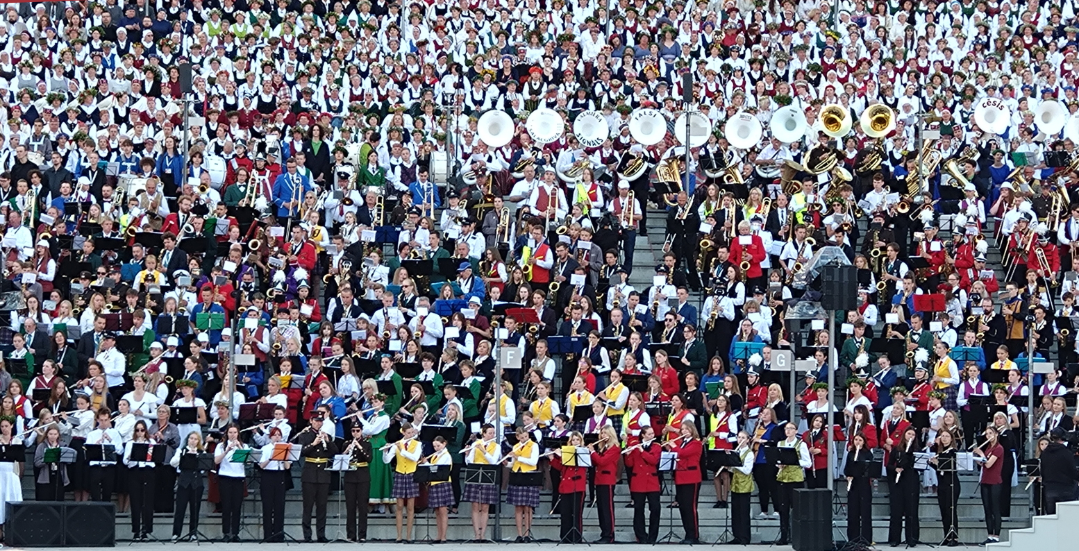 また、この祭典のプログラムでは、丘のような形をしたこの場所が、「ラトヴィアの人々には、春に丘に登って長い呼び声(ガヴィレス)を歌った羊飼いたちが最初の歌声だった、・・・ということと関連している」と言っている。主催者の正式発表では、271の混声合唱団 - 11572人の参加者 、80の女声合唱団 - 2468人、 男声合唱団23団体 - 707名、 シニア合唱団35団体 1007名、 青少年および高校合唱団36団体 - 1542名の合計17,296人と、 青少年ダンスグループ18団体 - 参加者630人、 ミドル世代のダンスグループ33組 - 参加者810人、 シニア・ダンス・グループ22組 - 参加者460人 キッズダンス16グループ参加者320名、 61のブラスバンド - 1800人、NBSスタッフ・オーケストラ、民族楽器クアクレ演奏団、そして合唱指揮者19人などであった(Latvijas Sabiedriskie Mediji---2つのテレビチャンネル、6つのラジオステーション、およびインターネットポータルを運営しているラトビアの公共メディアのサイトより)。この中には、泊ったホテルのロビーでお会いしたが、「日本ラトビア音楽協会合唱団」20数名の男女からなる日本人も、実力と過去参加の実績を評価され特別に参加していた。ステージではこのグループだけでまとまるのではなく、それぞれソプラノ、テノールなどのパートの席に分かれて歌うとのことだった。皆さんは「ラトビア」っぽく見えるオリジナルだと思われる衣装を着けていた。