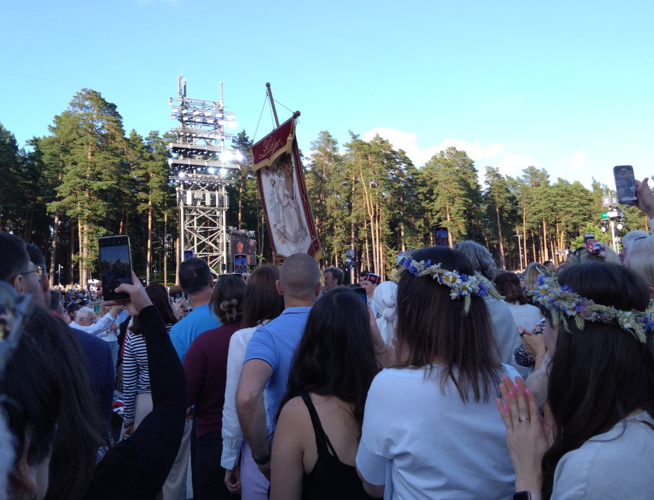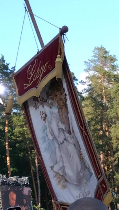 この女声ソロの入った歌が終わったところで、観客の皆が立ち上がって客席の真ん中の通路の方を見ながら歓声を上げた。この祭典の第1回からのシンボル、「リーゴの旗」の入場だった。この旗は、この「歌う祭典」だけのシンボルでは無くなり、今では10日間に及ぶこのフェスティヴァル全体のシンボルとなり、フェスティヴァル全体は、初日にまずこの旗が取り出されて公になるところから始まるのである。「踊りの祭典」でもそのシンボル旗が登場したが、こちらのリーゴ旗の方が遥かに古いだけ権威を持っている。ちなみに、エストニアでは大会シンボルは第1回の祭典が行われた地からの聖火だった。