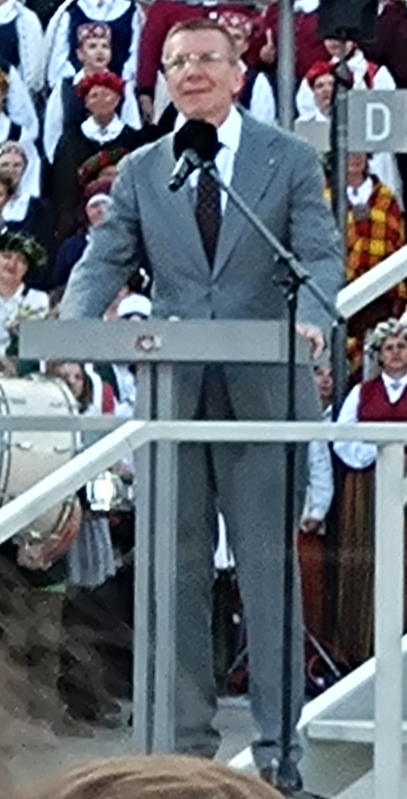 さらに、また場内が大歓声に包まれた。前日に就任したばかりのEdgars Rinkēvičs(エガドルス・リンケービッチ)大統領が現れたのである。彼は「同性愛者だ」と公表している大統領である。後で数分の演説内容を知ったが、祭典の伝統と参加者への賛美と、この民族の魂で共にさらなる発展したラトヴィアを築こう、というものだった。大統領は国歌「ラトヴィアに神の祝福を」を共に歌った後退出した。