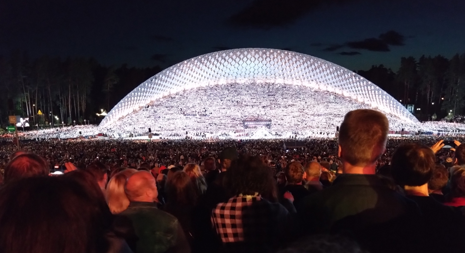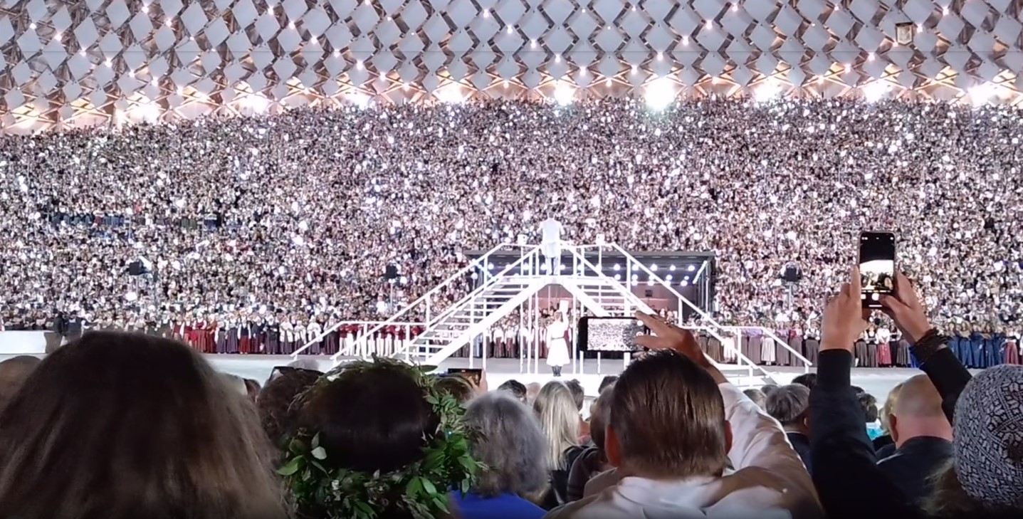 2023年7月9日、それは19:30から始まった。この「歌の祭典」のための特設ステージであるリガの「Mežaparka Lielā estrāde」(森林公園大ステージ)というところで。そこはリガのランドマーク「自由の記念碑」から北北東に歩いて約2時間の場所である。終わるのが23:30とのことで、ツアー添乗員は「途中で疲れてホテルにもう帰りたい人のために22:00にバスを用意しておいた。」と告げた。4年前のエストニアの同様の「歌の祭典」では、歌詞が全く分らず、エストニアの方々には申し訳なかったが途中で飽きてしまったので、私はその経験から「じゃあ22:00に帰ろう」と決めた。会場内の座席は、また旅行社のご努力でかなり前の方の真ん中の席であった。残念ながら「踊りの祭典」と同様に、一眼レフカメラは持ち込み禁止だった。この会場は2022年に改築が終えられ、50段近くの階段状になっているステージには16,000人の出演者を、観客席は可動席で30,557人、駐車場に観客を入れるとさらに50,000人を収容するという大規模なものである。「大舞台の建築コンセプトは、自然と人間の相互作用を歌ったラトビアの民謡に基づいている。このコンセプトは、ラトヴィアの風景と民謡に歌われる生活の知恵を連想させる『丘』、『木』、『鳥のさえずり』、『葉』という一連のシンボルに基づいており、舞台の全体的なイメージと空間構造を形成している。"銀の木立の中を私は歩いた-小枝一本折らずに..."。」(https://lv.wikipedia.org/wiki/Me%C5%BEaparka_Liel%C4%81_estr%C4%81deを翻訳したものより)。