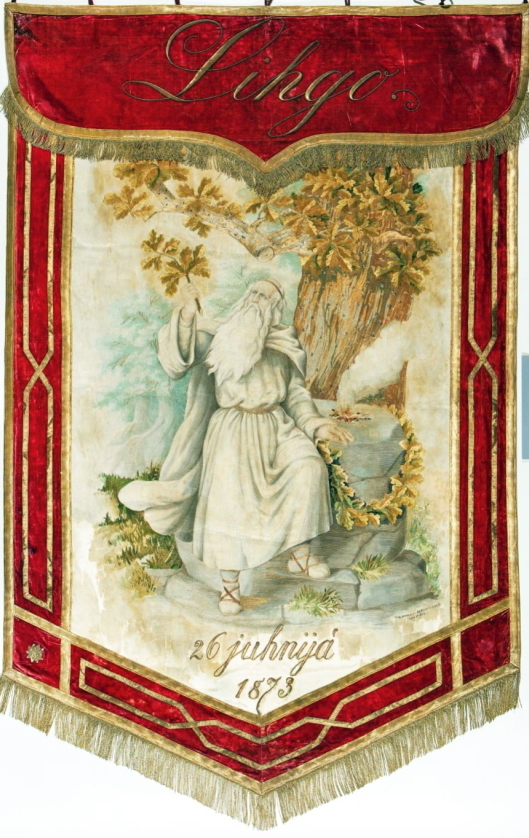 この旗を常時保存している、リガ・航海歴史博物館への問い合わせによると、1873年に開かれた第1回「歌の祭典」のとき、ラトヴィア各地の女性18人が資金を出し合って、ドイツの王宮工房に製作を特注したものだとのこと。絹のビロードで、中央に描かれた老人は、古代バルト三国の神官であり、宗教的儀式を執り行う者、また古代ラトヴィアの歌い手であり船乗りでもあった。 大きな古い樫の木の下には神聖な木立と祭壇があり、厚い葉で覆われ花輪がかけられている。祭壇の上では、供物の炎が燃え、煙が立ちのぼる。左腕でもたれかかり、掲げた右手に太いオークの枝を持って立っている。旗の上には赤いビロードに金文字で「Līhgo」(リーゴ)と刺繍され、下には白い絹地に金文字で「1873年6月26日」と書かれている。リーゴ旗と呼ぶのにはいくつかの説があり、一つは6月の夏至の祭りの時、Līgo !Līgo !と歌い踊られることから。Līgoは「揺らす」または「歌う」「祝う」という意味を持つとのこと。旗に記されているように、最初の「歌の祭典」が6月の開催だったことも関係している。もう一つの説はラトヴィアには古来喜びと愛の神である「Līhgo」がいて、この神官はその神に供物を捧げている、と言う説。私が問い合わせて、丁寧に回答をくださった方は、かなりの責任者の方であったが、第一の説の方を支持しているとのこと。ただし、これはレプリカの旗で、本物はこのフェスティヴァルの間だけ保存場所から取り出され、一般公開されているとのこと。この旗はステージのバックに掲げられ続けた。