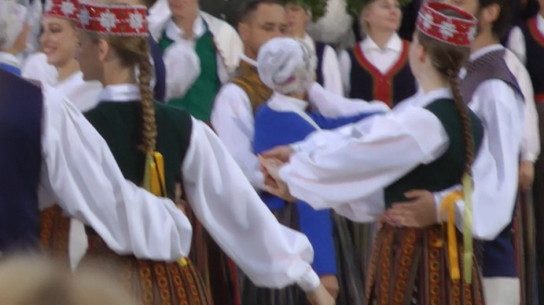 | 35 | 海が凍った | 2003 | ソロ、青少年ダンスグループ | ヴァルミエラ創作ダンスコンテストで「2004年」賞を受賞。ラトヴィアで今年最も人気のあるダンス(http://dejaszeltafonds.lv/より) 「海が凍ると、琥珀の海岸にいる最高に美しい娘たちのもとへ行くのが簡単になる。私の兄は琥珀の岸辺から妻を連れ帰った。彼女たちは花の橋の架け方、琥珀のシャツの作り方、琥珀の手袋の編み方を知っている。」(プログラムより抜粋)。2018年の祭典の映像では、クルゼメで少数派のSuitiの女性がソロを歌い、クルゼメの衣装を着けた男女が踊っていた。 |