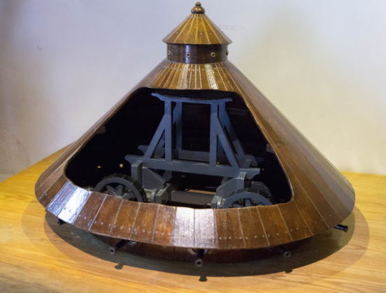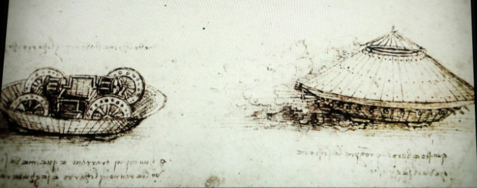 1483-85年頃「戦車」。8人の力で中から車を廻すもの。8本の大砲も備える。