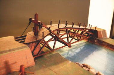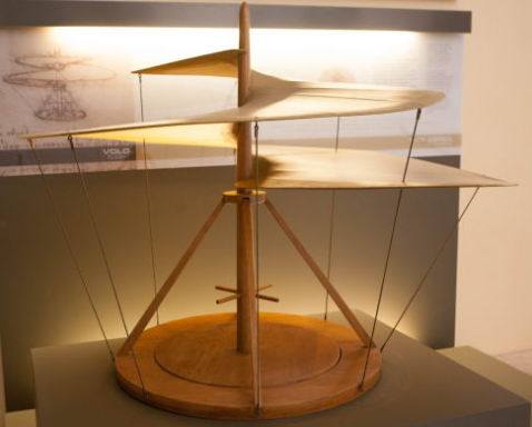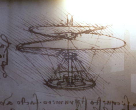1489年ころ「螺旋プロペラ飛行機」。半径4.8mのリネン布を張って、中央のマストに付けたレバーを4人が廻して飛ばす。「竹トンボ」に似た発想である。