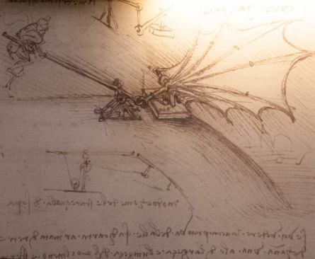 1487-90年ころ「羽ばたく翼」。紙を貼った翼を約60kgの重さの板に固定し、人力でレバーを素早く休みなく動かすことで全体を浮かせるというもの。