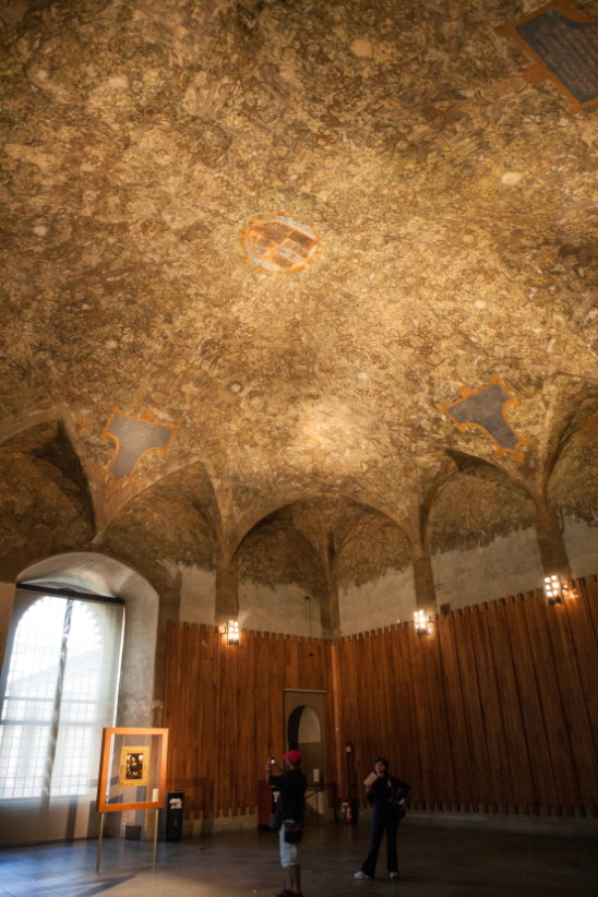スフォルツァ城内のアッセ(板)の間。ダ・ヴィンチの設計によるもので、天井が幹と枝、葉、下がっているものが根を示し全体で樹木を表すという