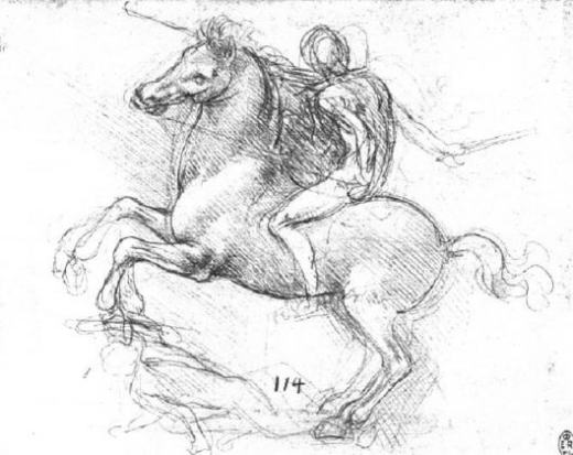 もう一つの偉大な業績となるべきだったのが、自薦状で言及した青銅の騎馬像制作である。1484年に命を受け、93年には塑像の模型が完成した。騎馬像は足もとから頭まで高さ7mを超えていた。しかし、ミラノ公が騎馬像のために確保していた100tもの青銅は、フランス侵攻に備える大砲へと変わり、さらに1499年ミラノを占領したフランス軍によって塑像も破壊されたため、騎馬像は幻に終わった。