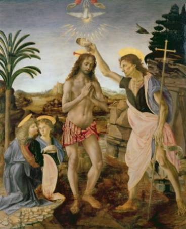 1472年ころ、師匠ヴェロッキオの「キリストの洗礼」の絵の制作に際し、レオナルドは絵の中に一人の天使を描かせてもらった(下の絵の二人いる天使の左側の方)。「愛らしく生き生きとして純粋な心を感じさせる天使」(青木昭『図説レオナルド・ダ・ヴィンチ』p12)は、レオナルドの処女作とでもいうべきもので、これを見た師匠のヴェロッキオは、弟子に劣るので以後絵を描くのをやめたというエピソードがある。
