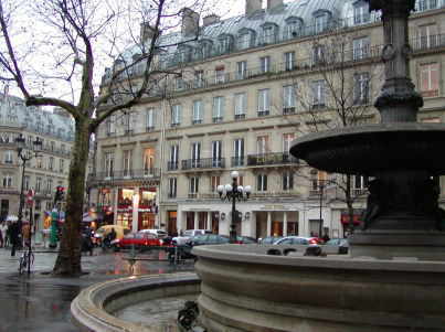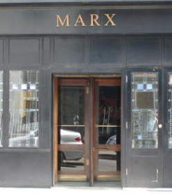 左は若きエンゲルス。マルクスとエンゲルスが再会し、理論の一致と友情を確認した、サントノレ通り161番地カフェ・ド・ラ・レジャンスの跡(真ん中の街灯の後ろの建物の1階。現在は旅行代理店のようになっている。)