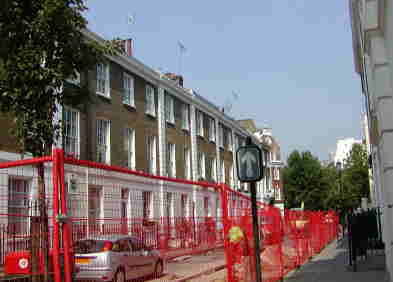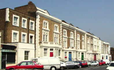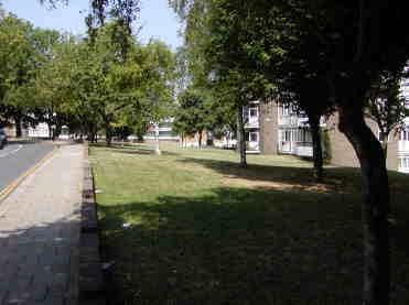 あたりは緑多い環境。真ん中の写真の赤いドアの家がマルクスの住んだ家。この家のすぐ近く、右の写真付近(空き地か?)にマルクス最期の家があったが戦災で崩壊したとのこと。
