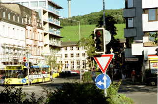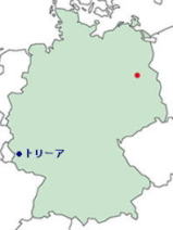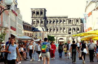 トリーアはモーゼル川に沿う町。真ん中の駅の裏はぶどう畑が続く。街中にはローマ時代の城門などの遺跡がある。