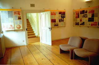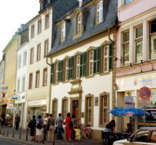 黒っぽい屋根の家が生家。真ん中は生家を示すプレート。現在はマルクス博物館。右は内部。