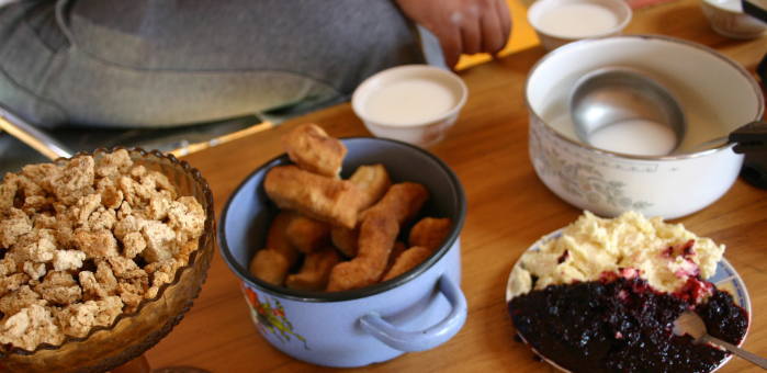 出された食べ物。右上が馬乳酒。度数はビールより弱いくらい。酸っぱいカルピス、というところだがそれだけではうまく表現できない。真ん中は揚げパン。少なくとも麦は購入したものと思われる。自家製のベリージャムとバター状のものを付けて食べる。バターはやや酸味があった。左はアーロールというチーズ状のもの。一緒に行ったオーストラリア人カップルは皆一口で止めていたが、私は(せっかくだから)と馬乳酒を二杯おかわりした。