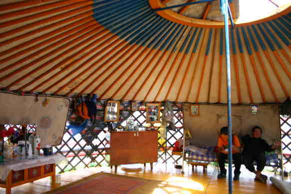 ゲルの内部。ゲルを覆っているフェルトを一部取って涼しくしている。ガイドは「日本人やドイツ人のようにきれいにしている家だ。」と言っていた。