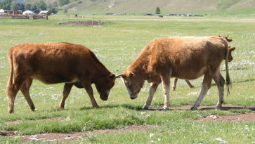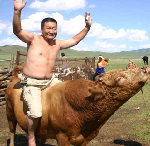 このお宅では、牛も遊牧しているが、ちょうどあちこちで「喧嘩」が始まった。面白かったのは、牛がどんどん集まり始めたこと。プロ野球の乱闘シーンのようだった。モンゴルでは牛も相撲を取るのと見るのが好きらしい。右写真の牛に乗ってるのがこの家の主人のお兄さんで都会から遊びに来ていた。私はこの人に初対面から気に入られてついに牛に乗せられる羽目に。写真を撮ると、彼は「NHKに出られるか?オレはチンギスハーンの子孫だ。」と言うので、私は「ネットで全世界に紹介する。」と約束した。まさにミニ「うるるん」でした。![]()