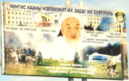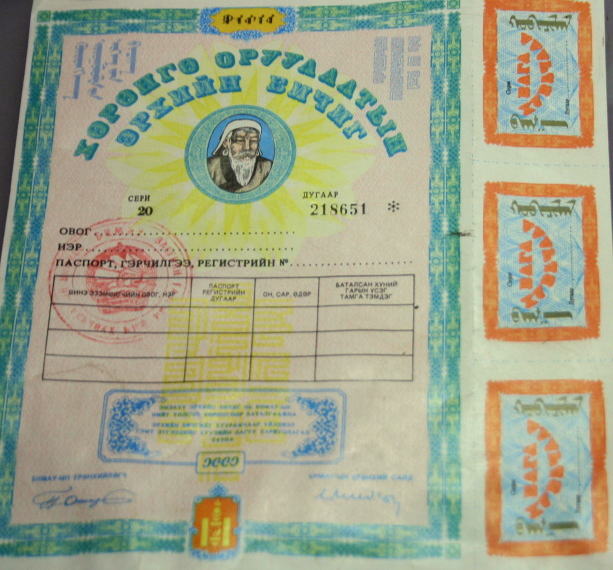 1990年代に民主化されたときに全国民に発行・分与された、国有財産分割取得証。そのデザインにチンギス・ハーンが復権。チンギスとモンゴル文字とラマ教が新たなモンゴル民族のアイデンティティを示すものとなっている。