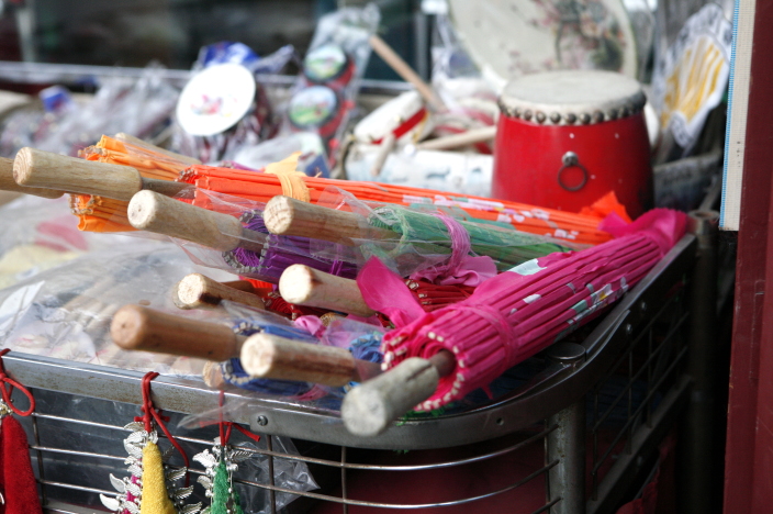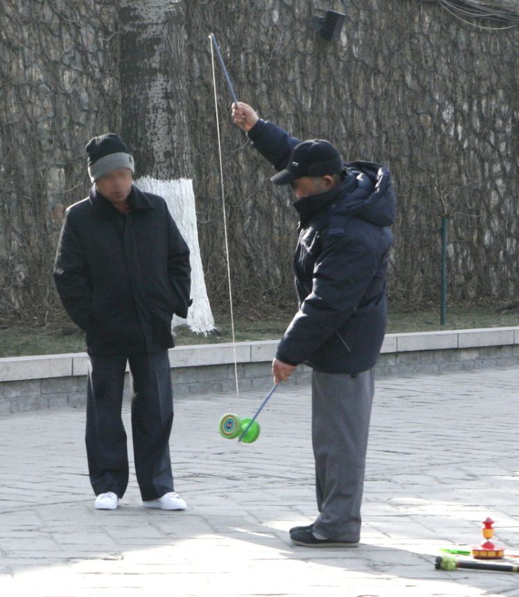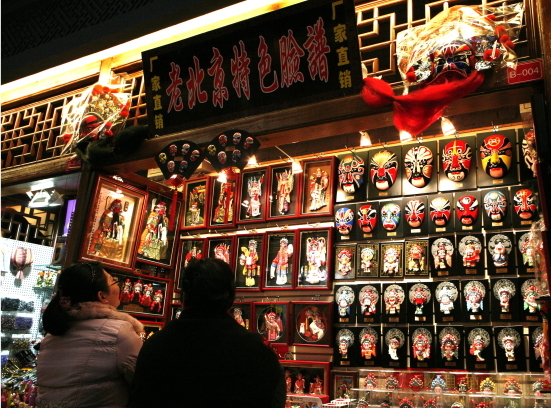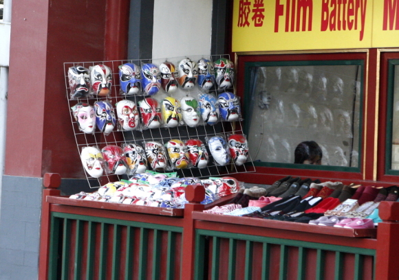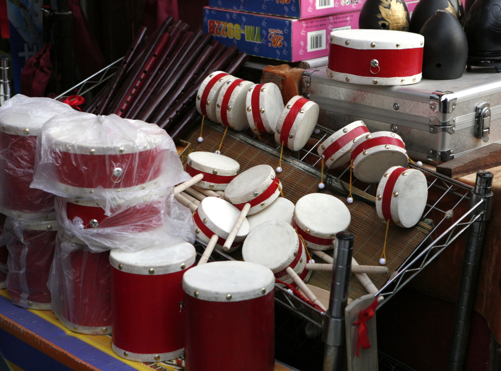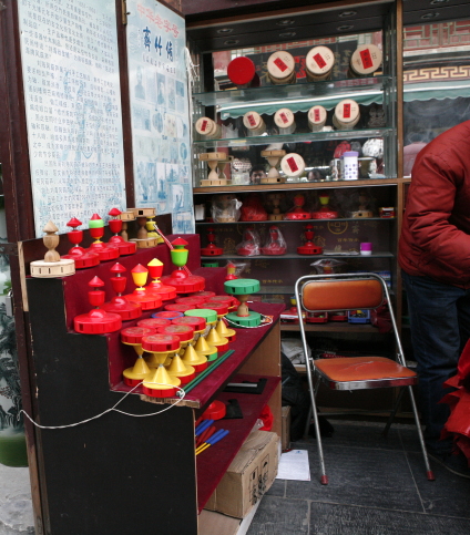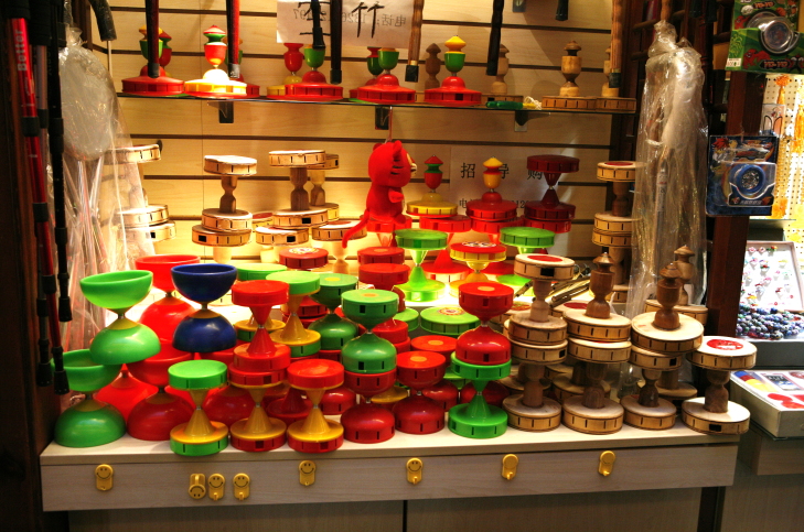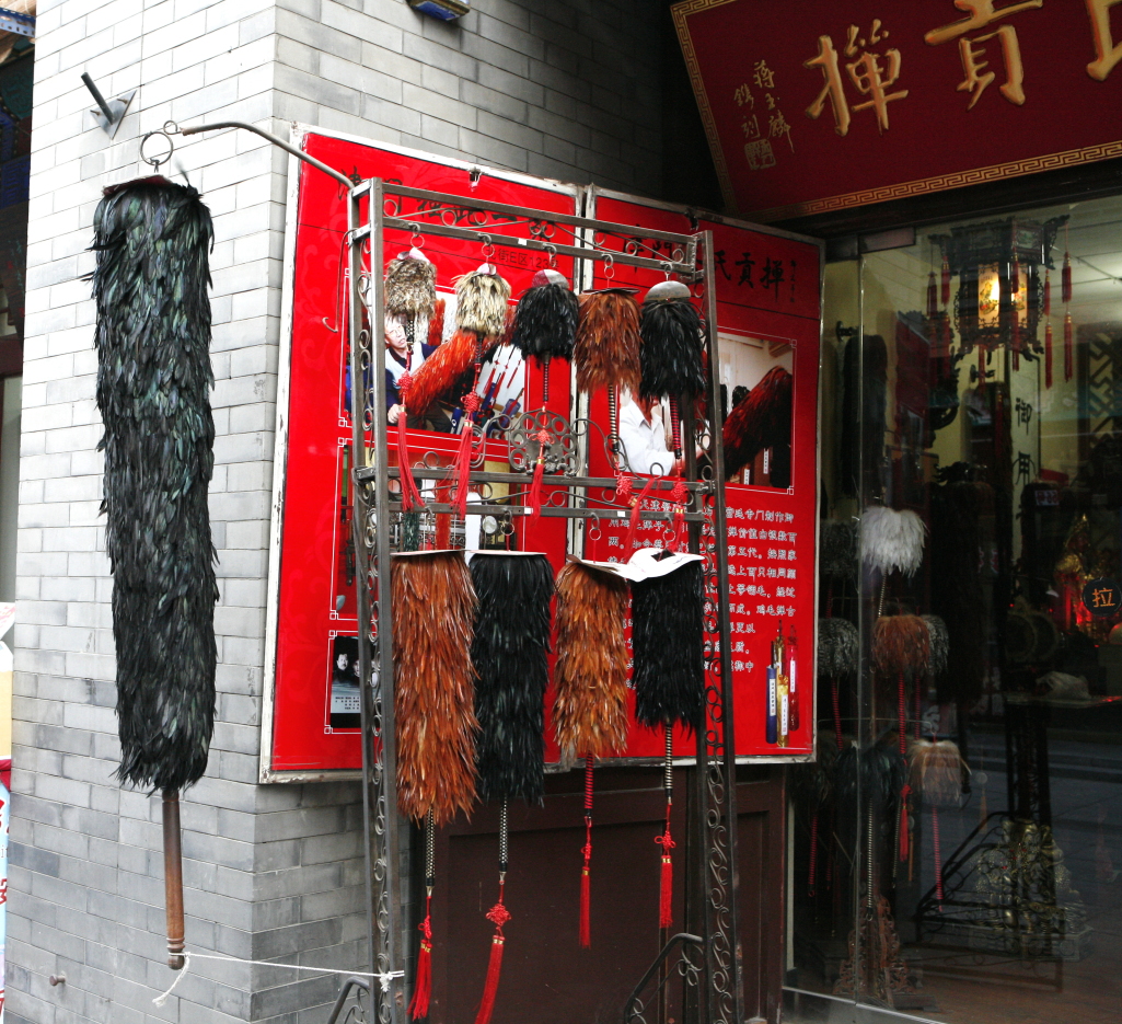 「蒼穹の昴」を見て、興味を持ったのが、清時代の街かどの露店や物売りの売っている品物の数々であった。現在の中国にその面影を求めてみた。テレビの中では、サンザシ飴、十二支を連ねた飾り物、羽根帚、独楽にあたる「空竹」、でんでん太鼓、日傘、京劇の仮面、飴細工、風車(かざぐるま)、女性の髪を結う細紐などだったが、このうちいくつかは売られていた。
