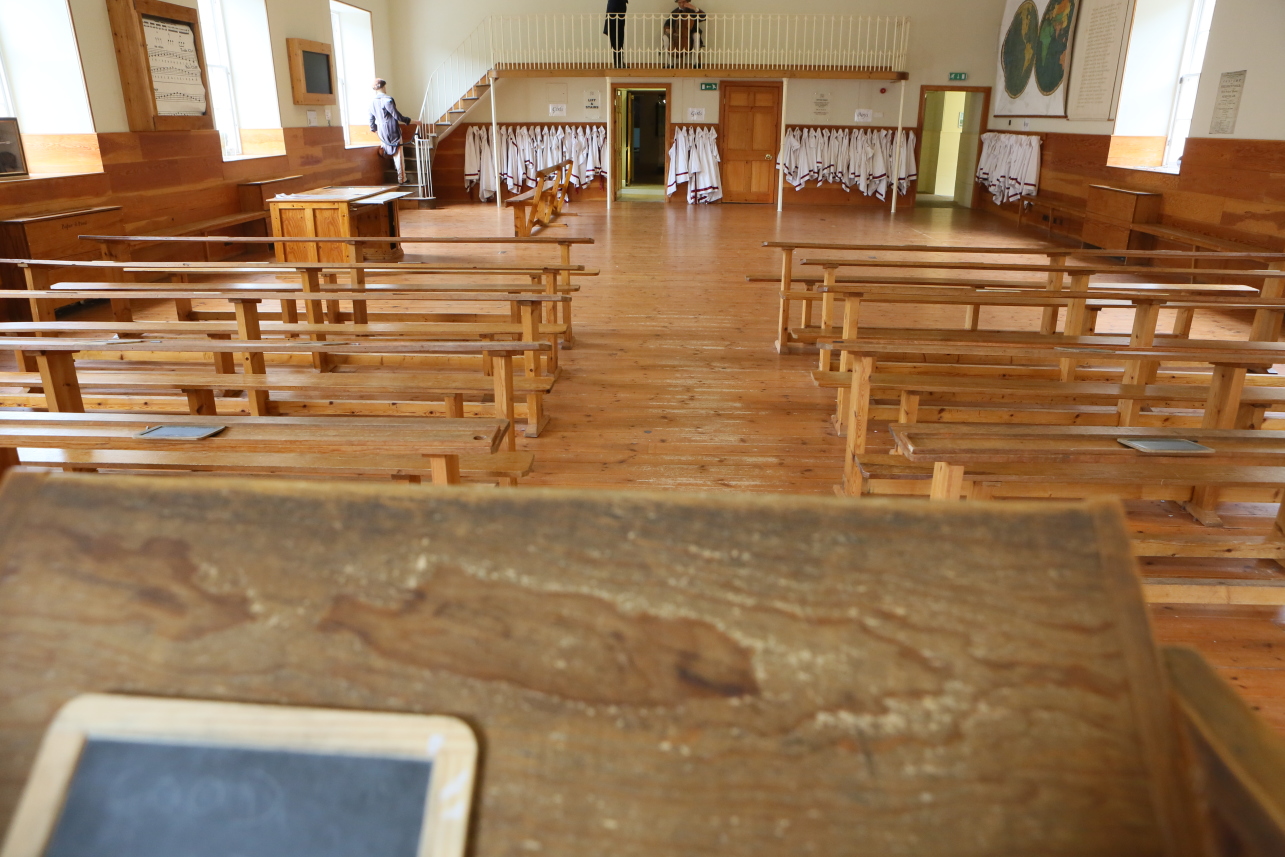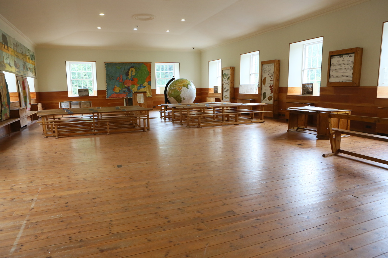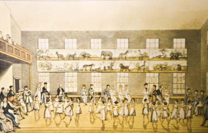 オーウェンのニューラナークの業績で特に有名なものが、児童教育の施設とシステムである。1816年に、2階建ての「人格形成のための新教育機関」が開校され、14人の教師と274名の児童がいた。入学年齢は満3歳で、10歳または12歳になるまで通わせた。少なくとも、10歳までの子供は労働を免除し、教育による人格形成を行ったのである。1階は3部屋でここで子供たちは読み書きを教わった。2階は、二つの大きな部屋からなり、演壇と周囲に回廊のある部屋は、講堂や礼拝所として利用され、もう一つには、壁に動物や鉱物の標本が並べられ、巨大な半球の地図が掛けられ、オーケストラ用の回廊もあった。子供たちはここで講義を受けたり、踊りや歌の授業もなされた。付属した運動場もあり、また戸外授業もよくなされた。学校には、オーウェンの考えた、活動しやすいローマ式の制服もあった。母親たちは、子供の世話をする手間が省けたため、子供に代わる工場の労働力を提供した。学校は経営の観点からも一石二鳥だった。夜間は、昼間工場で働く10歳から20歳までの年長の子供たちの学校として機能した。翌年、第二校舎も作られた。以下、この「新教育機関」に倣って1817年に建てられ、現在修復された第二校舎を見てみよう。
