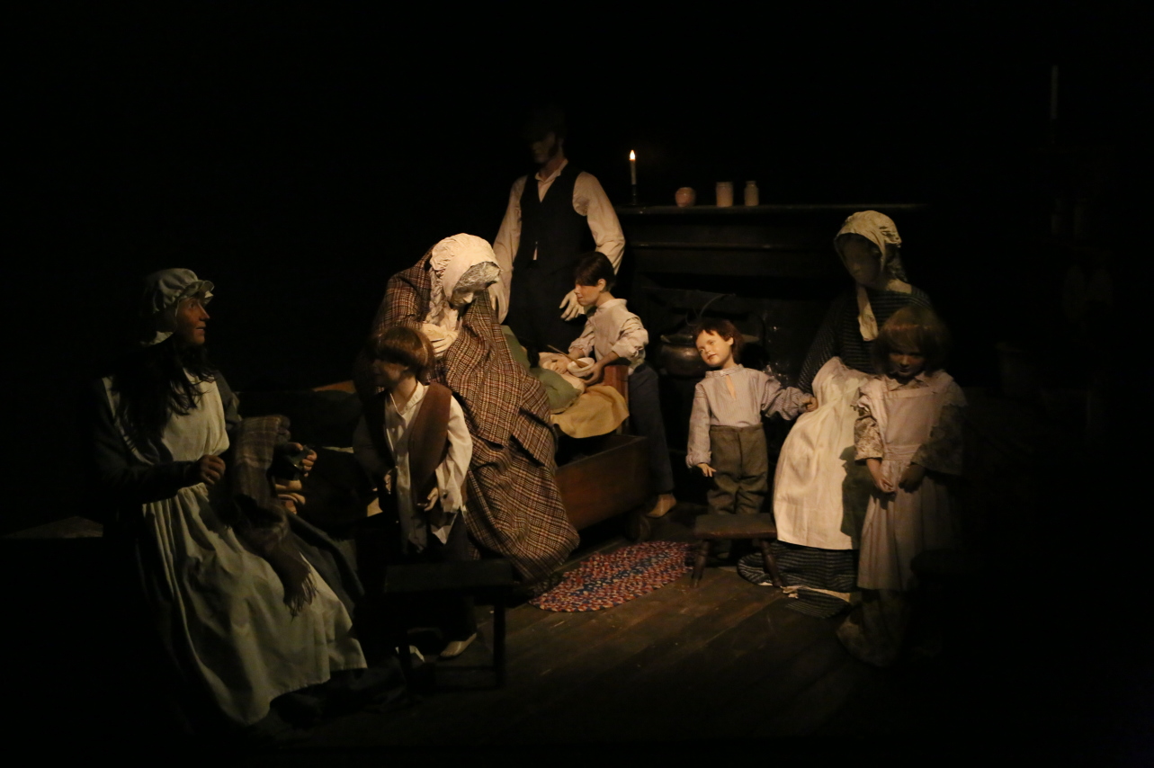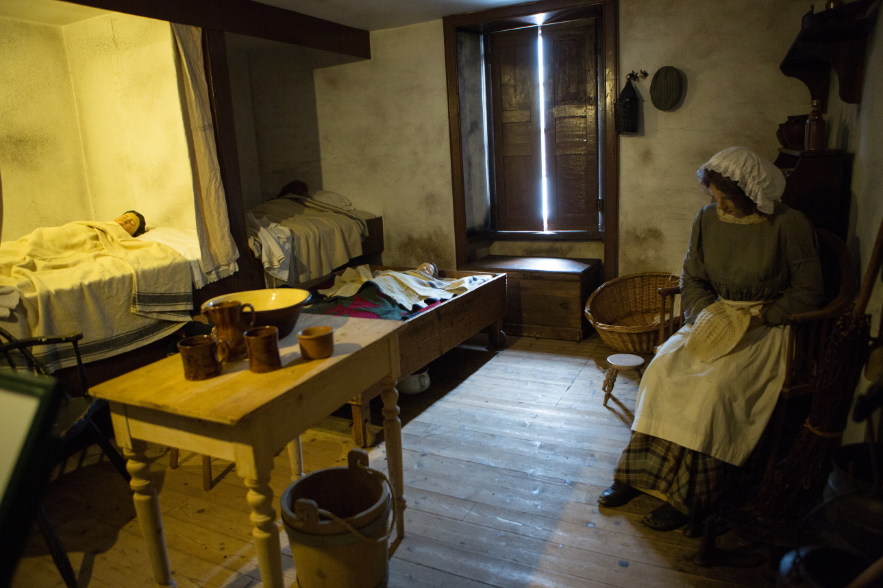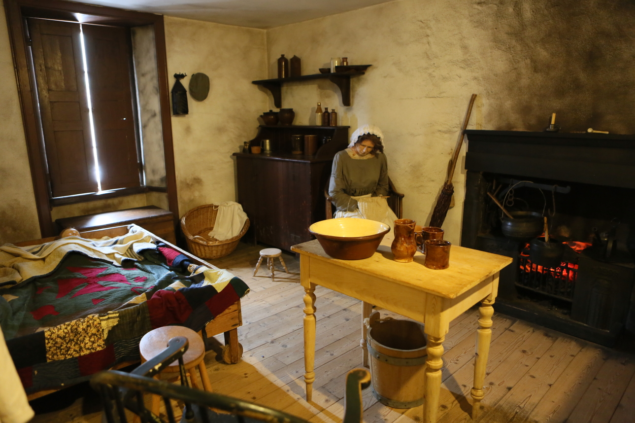 壁への据え付けベッドと幼児用「移動式ベッド」、テーブルと椅子、収納箱と棚が持っていた家具であり、調理も兼ねた暖炉があった。水は井戸から汲んだ。トイレは屋外にあり、共用した。