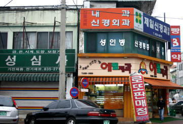 街を歩いていると店の看板は当然ハングルだが、それ以上に日本との違いを意識した。それは看板の文字の色が日本とは違う色使いだということ、特にかなり鮮やかな原色が多い、ということだ。また、看板も日本に比べて大きい。看板は商売のためなのだから当然だが、日本との美意識の違いがある。