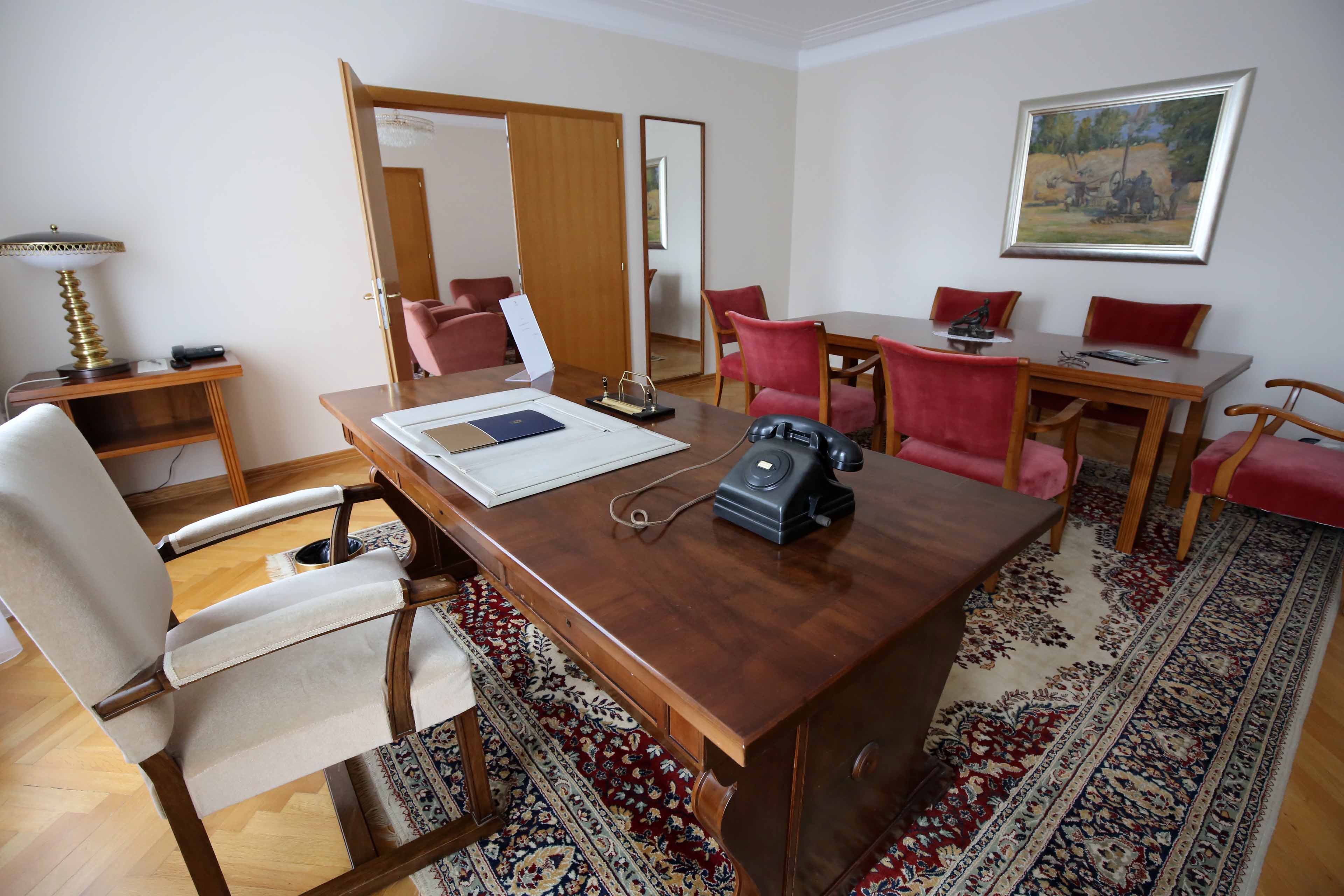 チトーが執務したという部屋。部屋自体は改装されているが、机、椅子、デスクランプ、電話機はオリジナルのものだという。