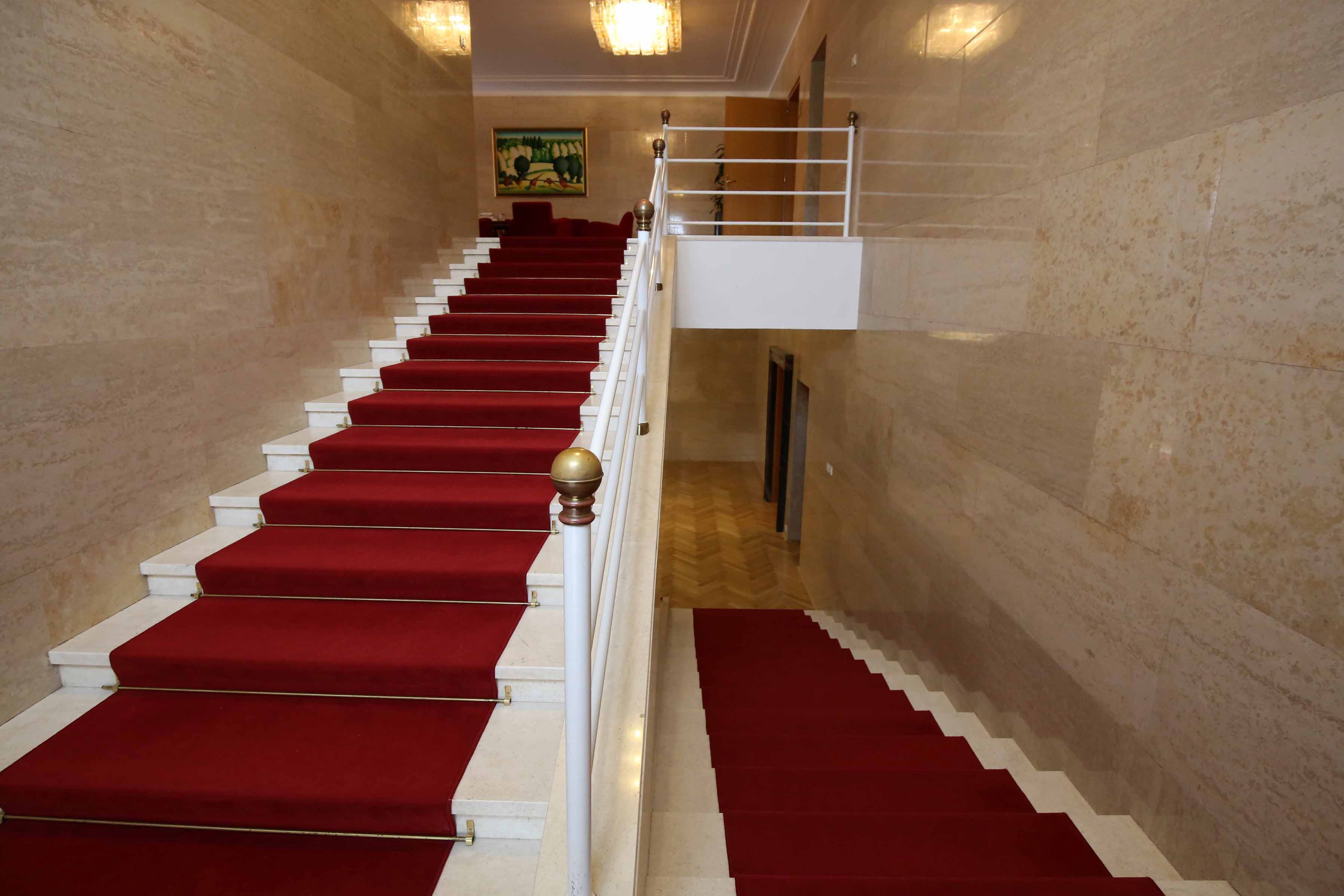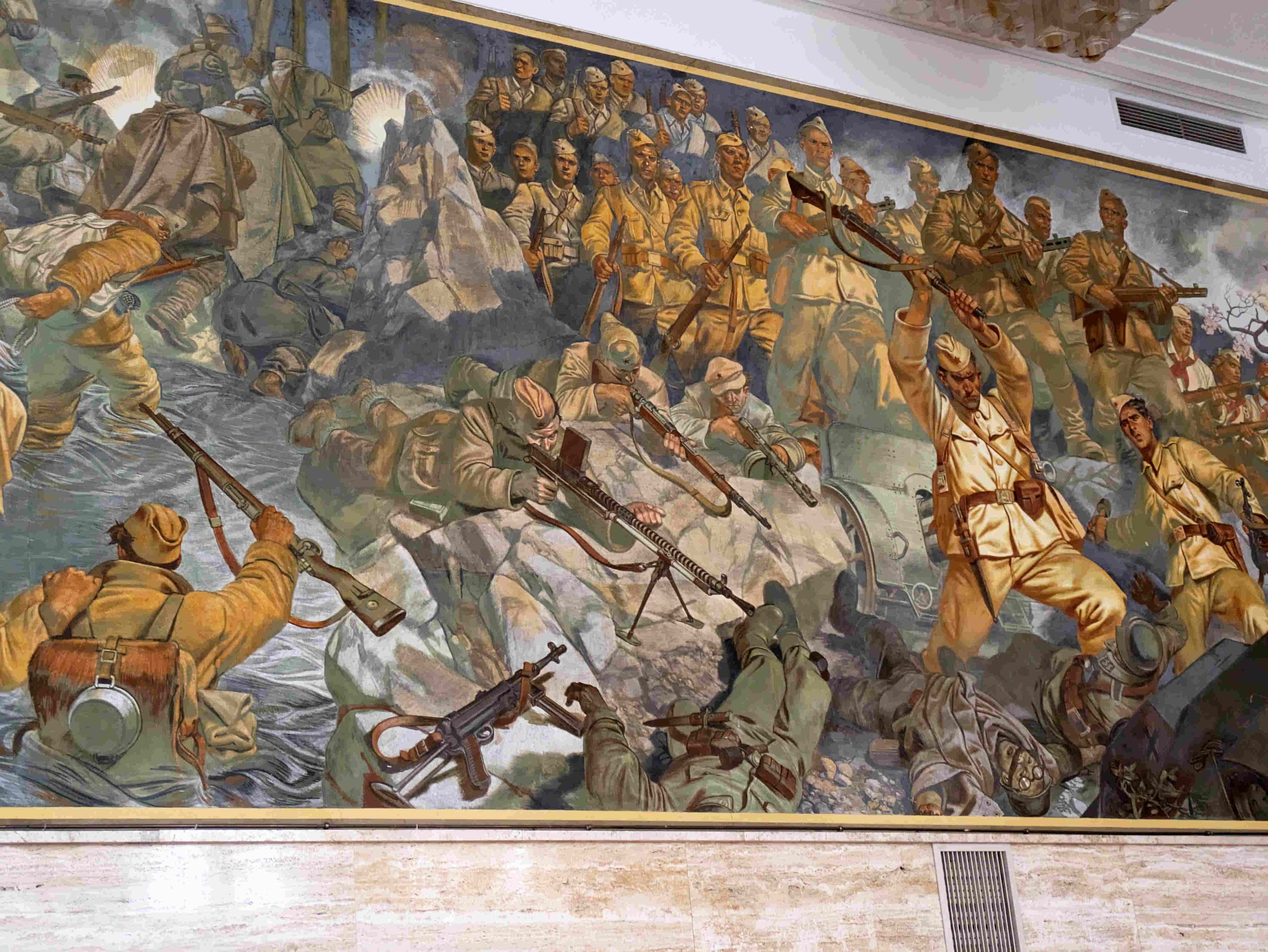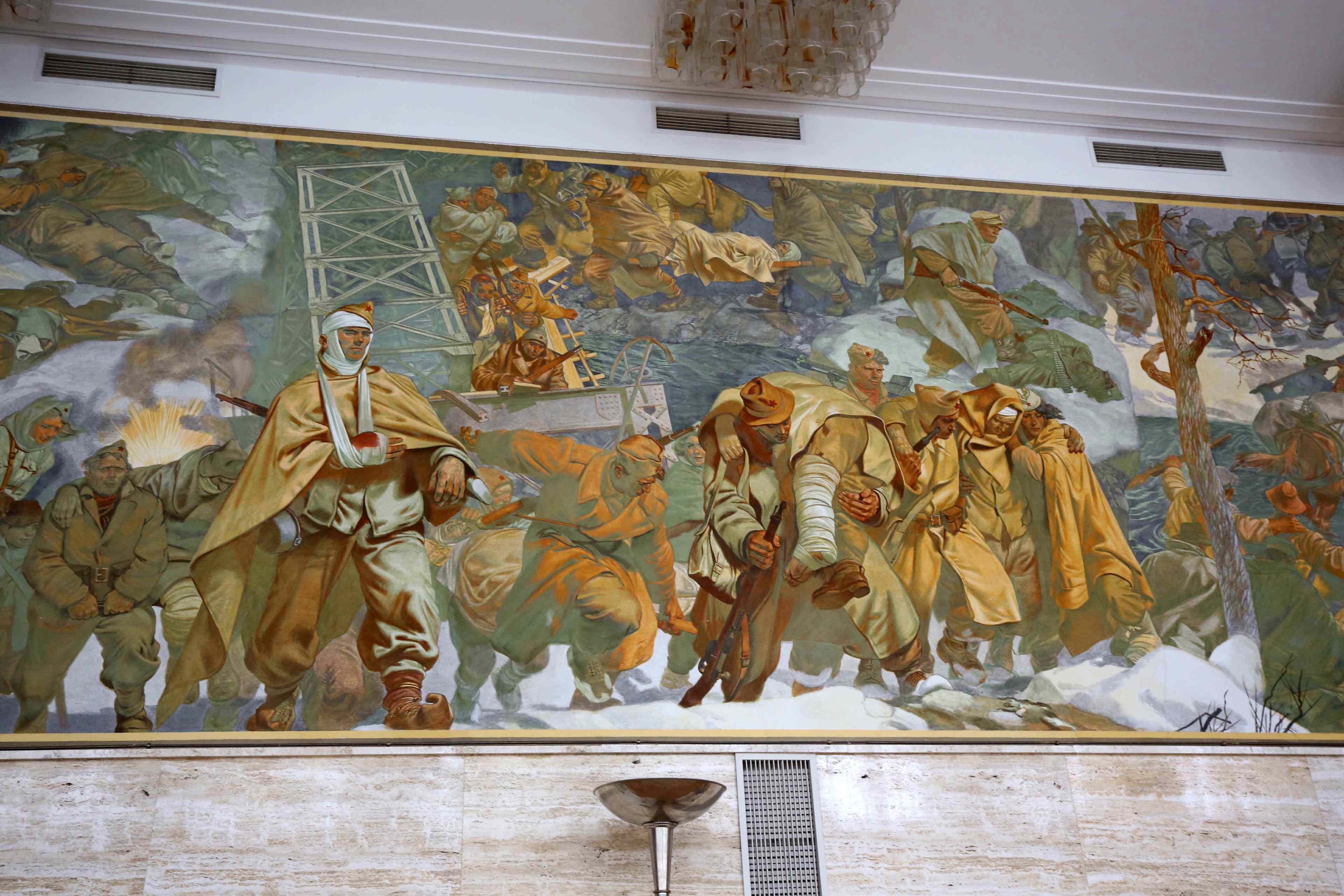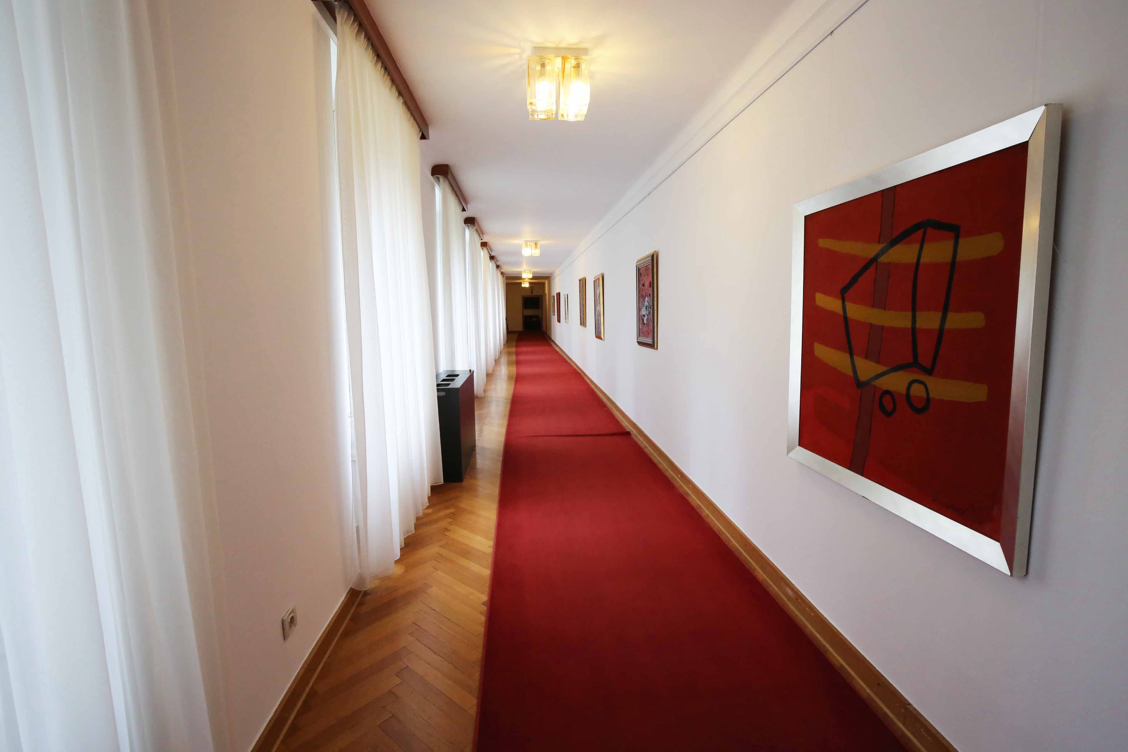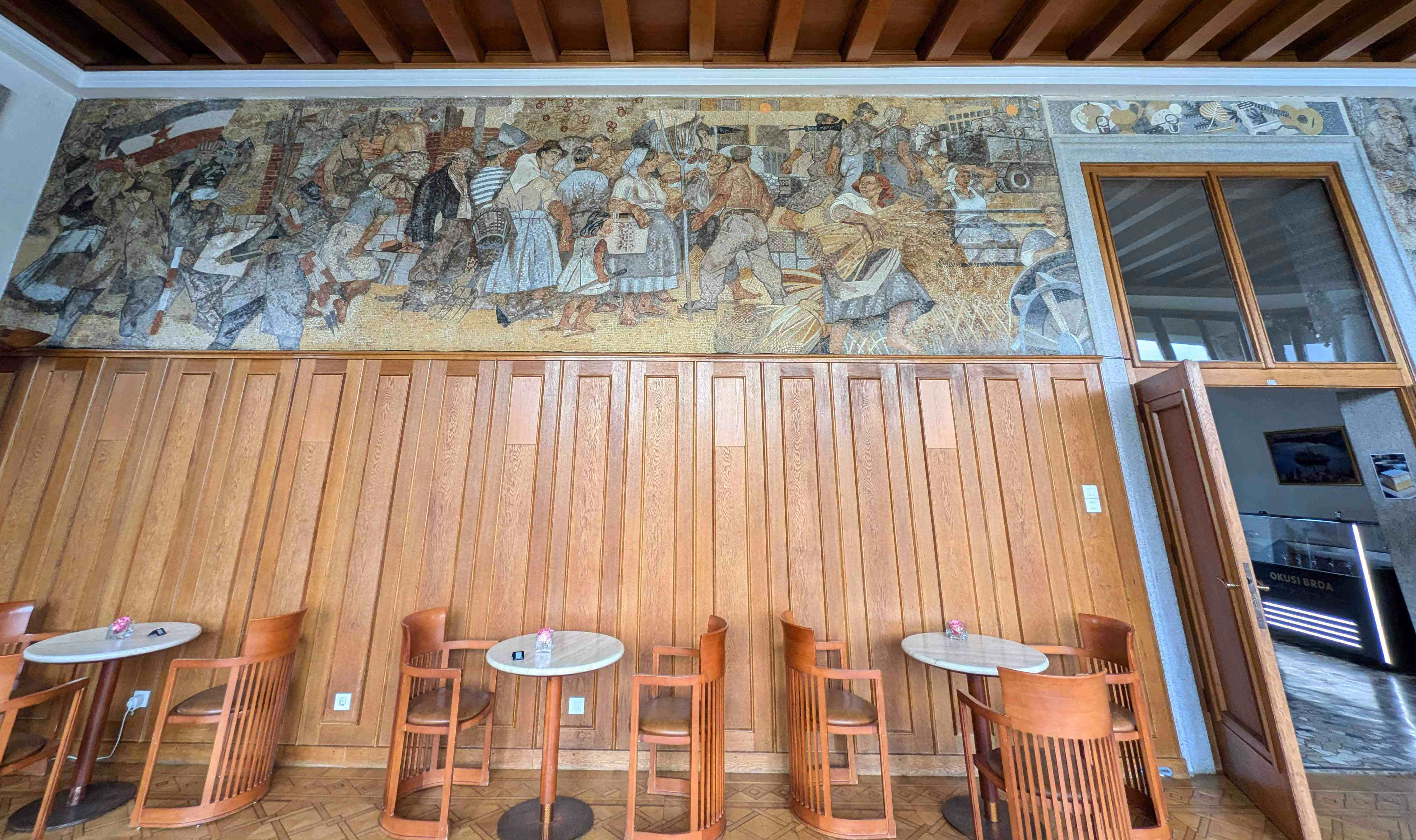 1階には、チトーのためのレセプションホール、映画館を兼ねていたホールが現存する。壁にはスラブコ・ペンゴフが1947年に描いた壁画がある。ユーゴスラヴィアにおける第二次世界大戦の始まりから解放までを描いている。また、奥の壁画は、ユーゴスラビアの「社会主義国家」としてのイメージを描いている。(上記サイトの説明より)