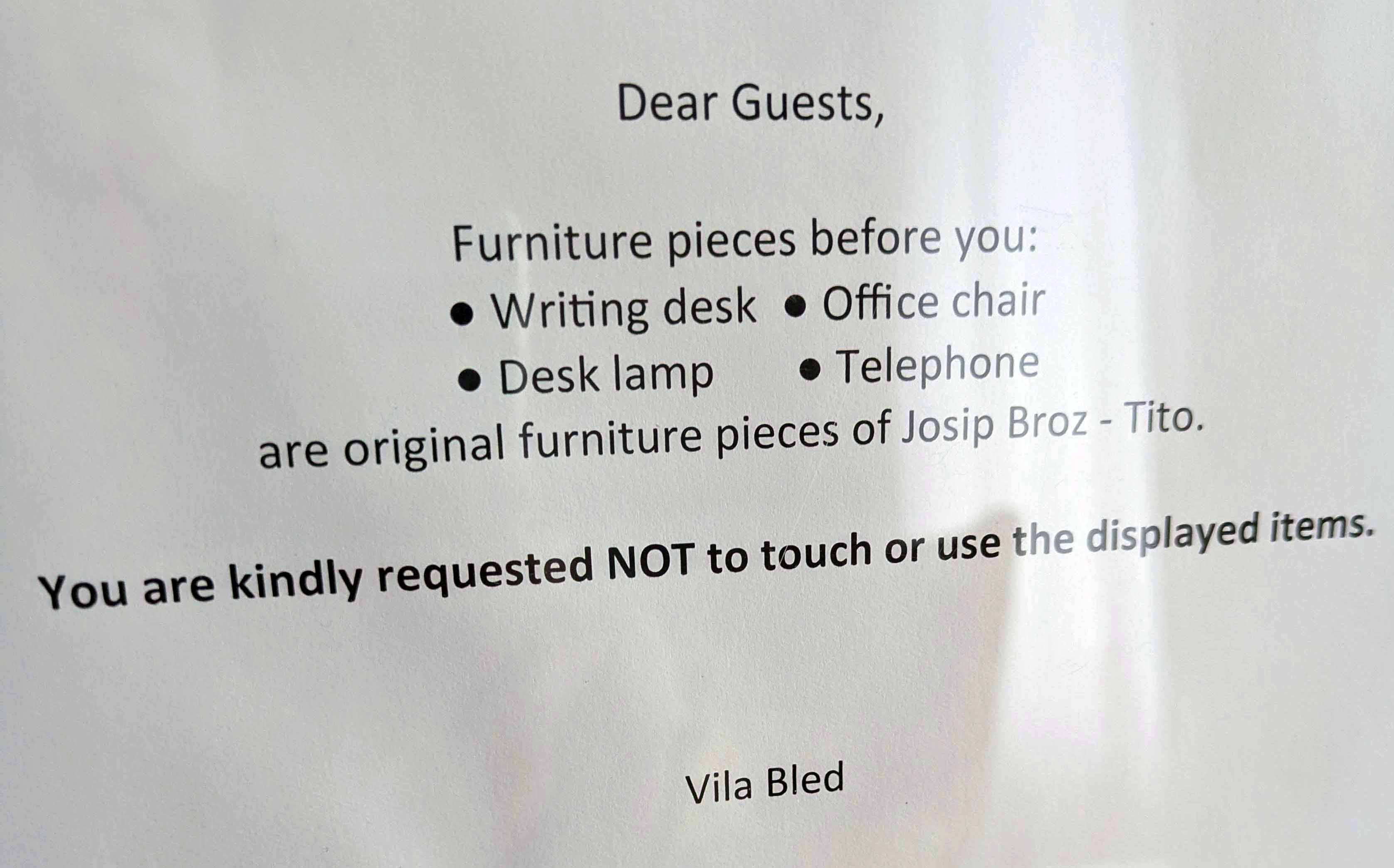 を見られたし。なお、以下の写真はすべて現地を取材した私の撮影によります。全体の感じとしては、当時のものは改装されて見られないが、最高権力者のものとして特別に豪勢、という印象は受けなかった。当時のスロヴェニアの一般の人の家とは比べようは無いが、全体としてコンパクトで洗練されている感じだった。2025年4月時点でホテルは五つ星ではなく四つ星であった。ただし、チトーは「1974年までに、ユーゴスラビア大統領は32の公邸、ヨット「ガレブ」(カモメ)、大統領専用機ボーイング727、ブルートレインを自由に使えるようになった。」(上記サイトより)ということで、たいへんな権力者だったのである。