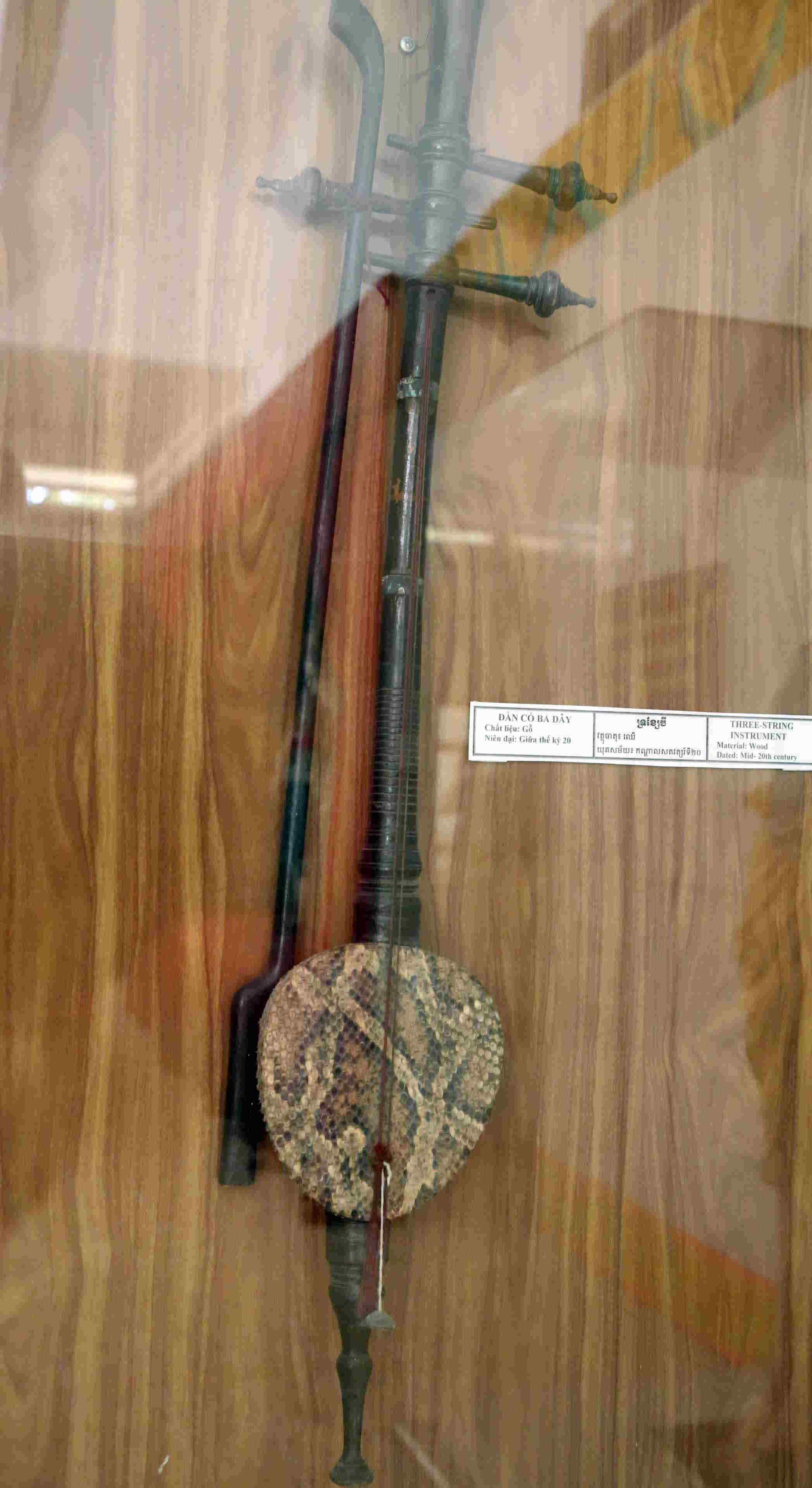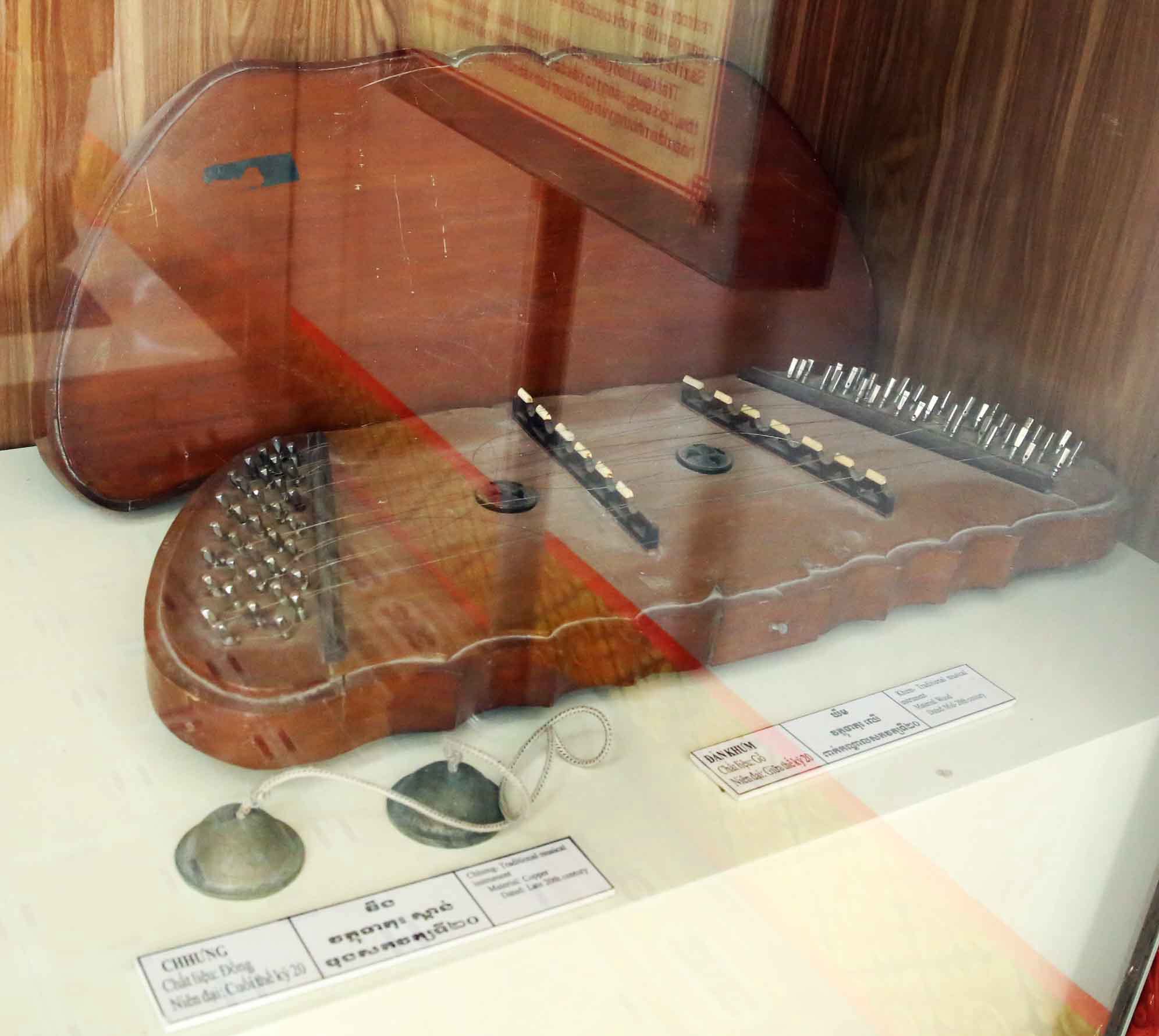 他にも興味を惹かれた、クメールの伝統楽器の展示もあった。下の左はTro Khmerトロ・クメール(またはトロ・クマエ)と言う、蛇の皮を貼った三線。右は撥で打って鳴らすKhum(クム)という打弦楽器である。特にトロ・クメールは、見た瞬間、沖縄の三線との共通性に思い当たった。両者は繋がっているのか? ところが調べてみると、沖縄の三線は中国の楽器を基とした、弦をはじくものであるが、このクメールの楽器は、「レバブの一種である三弦のスパイク・フィドルです。カンボジアにおけるその出現時期を特定することは不可能ですが、マレーシアやスマトラにレバブが登場した時期、すなわち15世紀頃とほぼ同時期に導入された可能性が考えられます。」(サイト「Sound Angkor」より)ということで、アラブのレバブという弾く弦楽器を出自としていた。しかし、三弦とし、蛇皮を貼ったのは、クメールにおける独自の文化だ、とのことである。たまたま、気候の似ているクメールと沖縄で音の響きを良くするため、両者は蛇皮を貼るようになったという。そしてこのクメールの楽器は弦で弾くところが沖縄の三線と決定的に違う。文化的起源を異にする二つの楽器が似たような外観になったというのはまことに興味深いことだ。