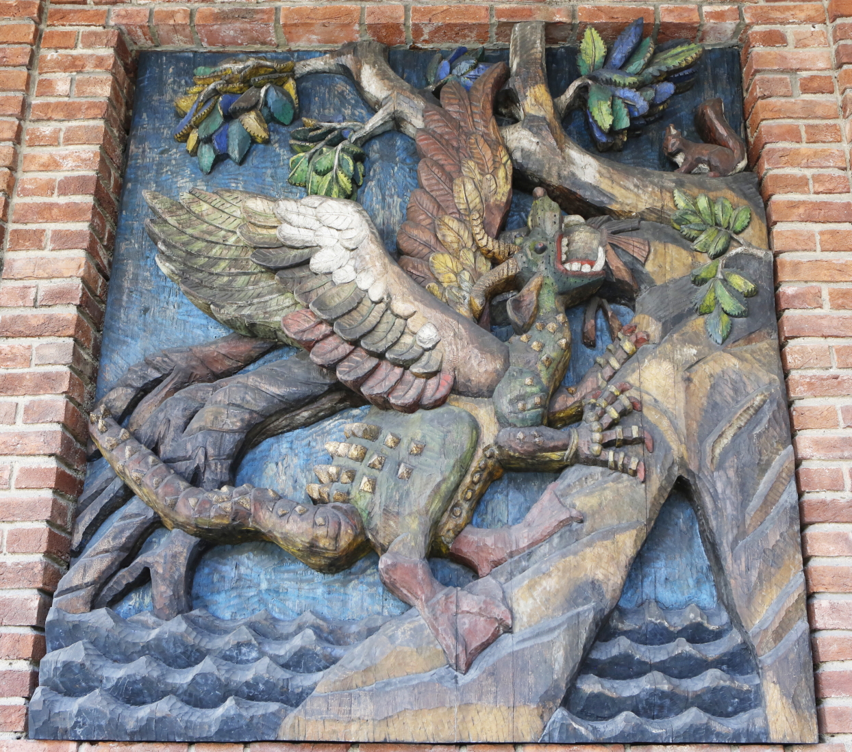 説明パネルには「ニーズヘグ(敵意と悪意をもって切るもの)は、世界樹のとねりこユグドラシルの3番目の根をかじり、引きちぎる、龍に似た蛇のような野獣である。ユグドラシルは3つの方向に延びる根をもつ。一つは巨人ミーミル(記憶)の泉、記憶の源泉に通じている。ここは今まで起きた出来事すべてが反映されているため、知恵に満ちている。オーディンが泉の水を飲むため質に入れた彼の眼が入っている。もう一つの根はウルズの泉に延びている。他方、3番目の根は、ニヴルヘイム(地下にある死者の国)のフヴェルゲルミルの泉に下りて行っている。そこでニーズヘグが恐ろしいことをしている。」とある。