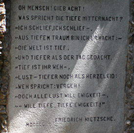 『ツァラトゥストラはこう言った』とデスマスク。シルス湖に突き出る岬の突端にはニーチェの言を刻んだ大きな岩がある。