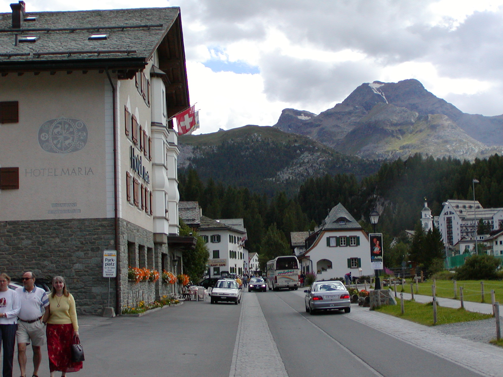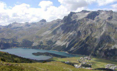 シルス・マリア湖。湖の右に見えるのがシルス・マリアの町。右写真は町の風景。