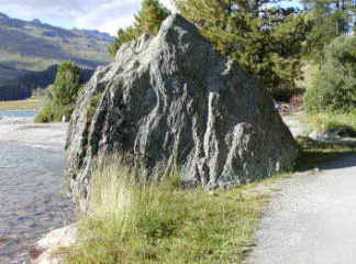 左がシルヴァプラーナ湖岸の散歩道(現在はサイクリングコース)。右が三角岩。2m50cmくらいの高いものだった。私の足でシルス・マリアから三角岩まで45分かかった。