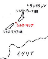 ニーチェは何回もこの美しいアルプスの地を訪れた。現在はサン・モリッツからバスで30分くらいで到着できる、シルス・マリア湖のほとりの小さな町である。私が訪れた2002年8月8日は天気に恵まれ、ほぼ一日中、美しい景色を眺め、散策し、よい空気を吸うことができた。ただし、ちょっと牛や馬の排泄物の臭いも吸収してしまったが。