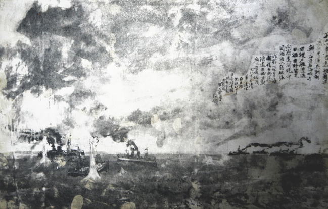 1894年 開戦へ朝鮮の古阜(現全羅北道井邑(チョンウプ)市)で2月に事件が起きた。当時の郡守が農民を駆り立て新しい灌漑水路や堰を作らせたが、完成すると農民から高い使用料を強要するなど私腹を肥やしていた。全琫準(チョンポンジュ)率いる1,000名の農民は郡役所を襲撃した。5月31日には1万名に増えた農民軍が道都全州に無血入城し、漢城(ソウル)に向かい、特権貴族を滅ぼそうという勢いとなった。甲午農民戦争である。朝鮮政府は清国に軍事的援助を求め、6月、清兵2,500が全州に近い牙山に上陸した。日本は、1885年の清との天津条約に基づき、居留日本人保護を名目に3,000名が出兵し漢城郊外竜山に宿営した。1880年代に日本と清は朝鮮の政治を巡って軍事的衝突を起こしており、妥協の産物として「朝鮮出兵の際の事前通知」という天津条約が結ばれていた。介入を恐れた農民軍は朝鮮政府と和解して解散した。両国軍は駐留を続ける名目が無くなったが、日本はこの機をとらえて清国と一戦交えようと、7月23日、朝鮮王宮を占拠し、国王の父である大院君(たいいんくん)に新たな政権を樹立させ、清国軍の撤兵のための援助を日本に依頼させ、開戦の名目を得た。7月25日、日本の連合艦隊(常備艦隊と西海艦隊による)の3隻が、豊島沖で、清の援軍派遣を警護していた清の2隻と遭遇し、撃ち合いとなったことから、戦端が開かれた。このうち清の1隻を航行不能とした。直後に現場に近づいて来たイギリス商船は1,100名の清兵を乗せて半島に向かっていたが、日本は「船が兵らに乗っ取られた」として撃沈した。豊島沖海戦図(劉公島 丁汝昌記念館より)7月29日、陸上では、4,000の日本軍が成歓の陣地の3,500の清軍を攻撃して撃退し、清軍の朝鮮からの追い出しに着手した。そして、8月1日、両国とも宣戦布告をした。清では直隷総督兼北洋大臣の地位にあった李鴻章(りこうしょう)が朝廷の信任厚く、外務と配下の北洋軍統率をして、日本軍にあたった。1884~85年の清仏戦争で広東艦隊や福建艦隊などが壊滅状態だったこともあり、また「中国全体で日本から防衛する」という意識が未熟で、日本と戦った清軍は事実上北洋軍中心であった。李鴻章