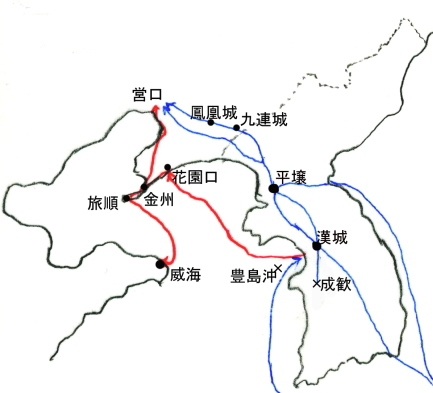 鳳凰城占領後の第一軍は、本来の「清軍牽制」の任務から離れ、大本営の指令とは反しつつ東北地方制圧への野心に傾いていった。1895年3月までに牛荘、営口まで占領地を広げた。平野での決戦を目標とする大本営は、渤海からの上陸を可能とするため、12月に威海、劉公島の北洋艦隊壊滅を目指す作戦を立てた。第二軍があてられ、1895年1月20日に山東半島に上陸し、威海の湾岸の砲台を攻撃占領し、威海沖の劉公島を本拠とする北洋艦隊に対した。2月5日と6日の未明、16隻の水雷艇からの魚雷攻撃や湾岸からの砲撃で、旗艦定遠など3隻を撃沈し、4隻を捕獲した。北洋艦隊丁汝昌(ていじょしょう)は12日、兵員の助命を条件に降伏に応じ、服毒自殺した。