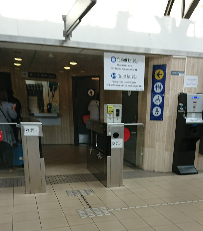オスロ駅の公共トイレもカードで20クローネ(2019年8月当時の換算で230円余)で入る。