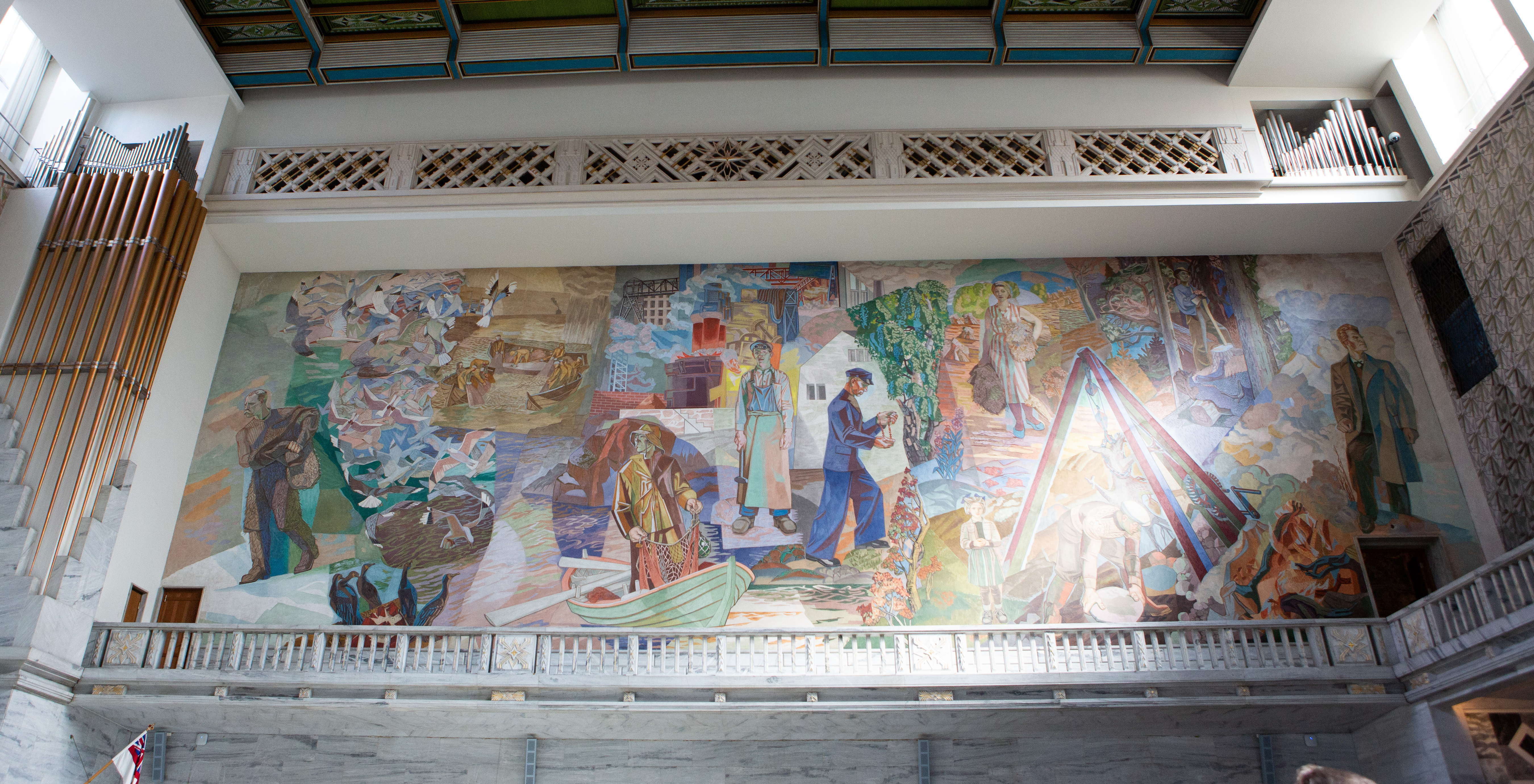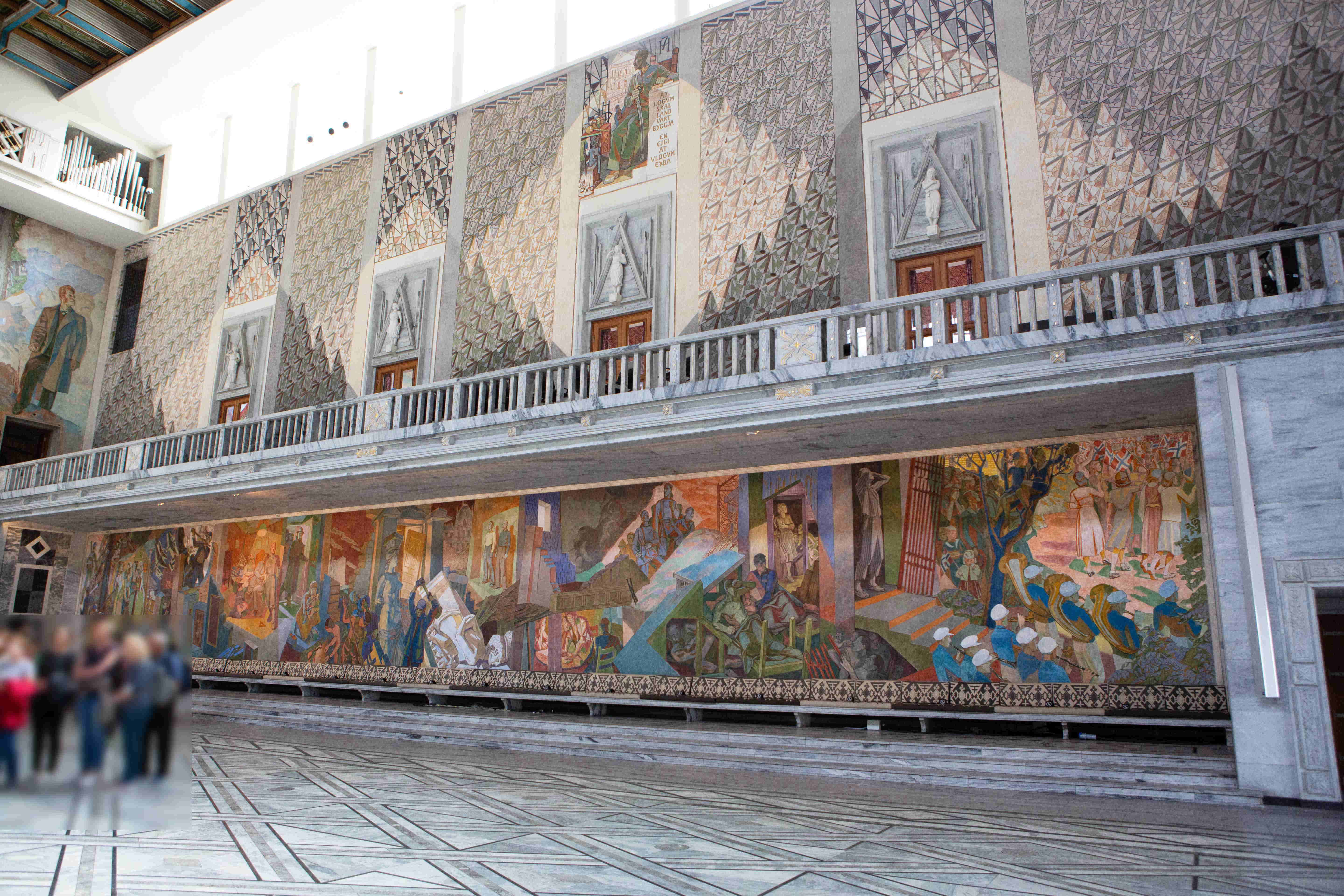 「“Arbeid、administasjon、fest”(仕事、行政、祝祭)というタイトルの巨大なパネル画で、オスロが市庁舎周辺の特徴であった貧困を平和的、民主的な手段で克服したことを示している。絵は3つの部分に分かれており、下の部分は貧しいオスロが取り残されていく様子を描いている。中央部分は調和と共同体を称えている。戦争を終えて故郷に帰る王でさえ、他の人々と同じ高さで描かれている。上部には、核家族を中心とした幸福な人々の、ほとんど宗教的なムードがある。」(Rådhussalen i Oslo Vi bruker informasjonskapsler for å forbedre brukeropplevelsen. Besøk vår informasjonsside for mer detaljer, eller finn lenken i bunnen av NRK.noのサイトの翻訳による.)上方のバルコニーの手すり、その下の壁、床はノルウェー産大理石で覆われている。また、この写真の中で人々が集まって見ているところには、今までノーベル平和賞を受賞した人々の簡単な業績を紹介したものが展示されていた。