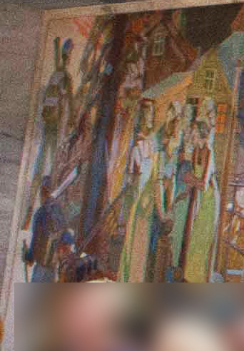 反対側の壁(この下にある出入口からこのホールに入る)には、ノルウェーの画家アルフ・ロルフセン(Alf Rolfsen )によるフレスコ画が掲げられ、「40年代から50年代にかけてのノルウェーの主な職業が描かれている。漁師、農民、船乗り、工業従事者。」(サイト「Visit The Oslo City Hall (A Guide) https://norwaywithpal.com/norway-travel-blog/visit-the-oslo-city-hall/より「『西の流し網から東の森までのノルウェーの産業』を表現している。ノルウェーの産業界の代表者たちの左側には、ノルウェーの対外的な探検を象徴する★ナンセンが並んでいる。右側には・・・作家※ビョルンソンの肖像画があり、内なる精神的な広がりを象徴している。」(ホール内部の展示の説明の翻訳)★北極近辺の探検を行った※ノルウェー国歌「我らこの国を愛す」の作詞者であり、日本では『日向ヶ丘の少女』の作者として知られている