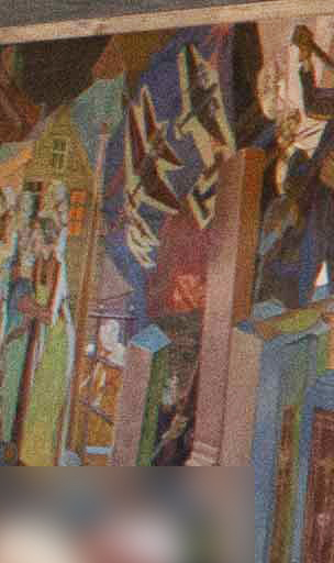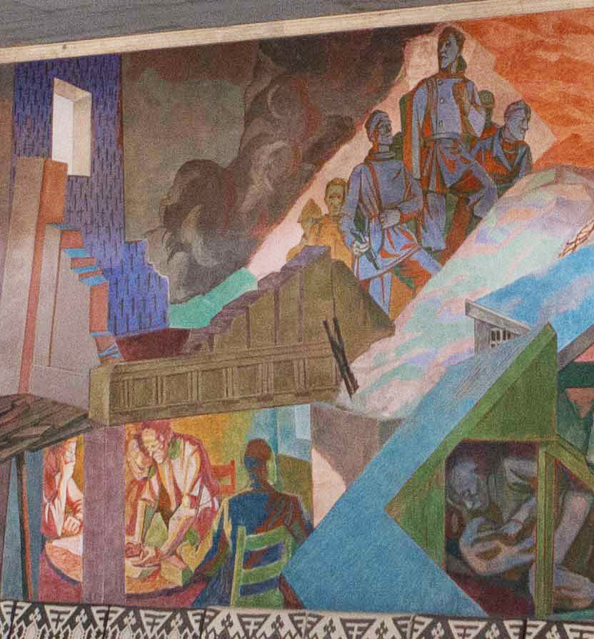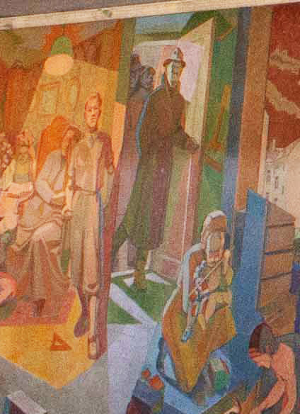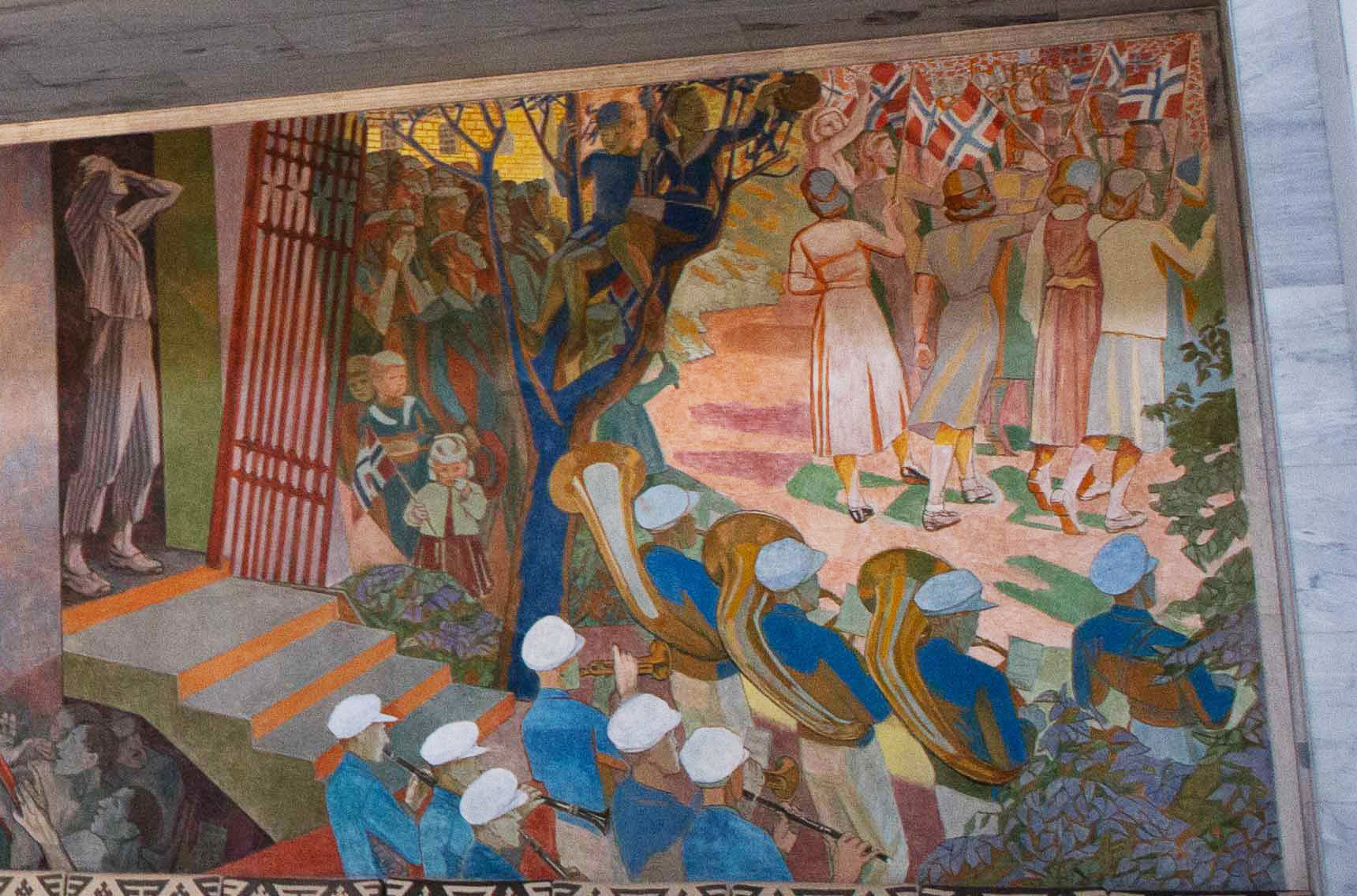 そして正面に向かって左側には、アルフ・ロルフセンの次の絵が掲げられている。「東壁のギャラリーの下に、ロルフセンはヒトラーとナチズムに対するノルウェー国民の抵抗を称える『占領フレスコ画』を描いています。このフレスコ画シリーズは、ドイツ人がどのように国を占領し、古いノルウェー文化を徹底的に破壊したかを物語っています。この写真シリーズの興味深い点は、ロルフセンが中世やルネサンスで一般的だったように写真を個々のシーンに分割しておらず、純粋に映画的な方法で、あるシーンがほとんど気づかないうちに次のシーンにスライドすることを可能にしていることです。ここで彼は、ピカソの『ゲルニカ』など、イタリアのルネサンスとキュビズムの両方からの洞察を利用しています。」(同上より翻訳)「壁には、アルフ・ロルフセンが自らの経験をもとに描いた『占領下のフリーズ』が描かれている。左側には、レジスタンスの男たちが森に飛び立ち、女たちが立ち話をしている。飛行機が飛び、船が沈む。独裁政権の代表が部屋に入り、母親の恐怖と少年の怒りが伝わる。外では占領軍とその支持者が国を破壊している。ゲシュタポのヴィクトリア・テラスから廃墟越しに見た右側には、レジスタンス戦士のヴィックストラーとハンシュタインが処刑壁に向かって立っている。地下室にはレジスタンスの独房が隠されており、パルチザンが朝の空を背景に据えられている。彼らの目の前には強制収容所があり、ある日門が開かれ、囚人たちが光に向かって流れていく。平和の祝典は今や平和を集め、5月17日の建国記念日の行列は『見えない未来』へと突き進む。」(ホール内部の展示の説明の翻訳)