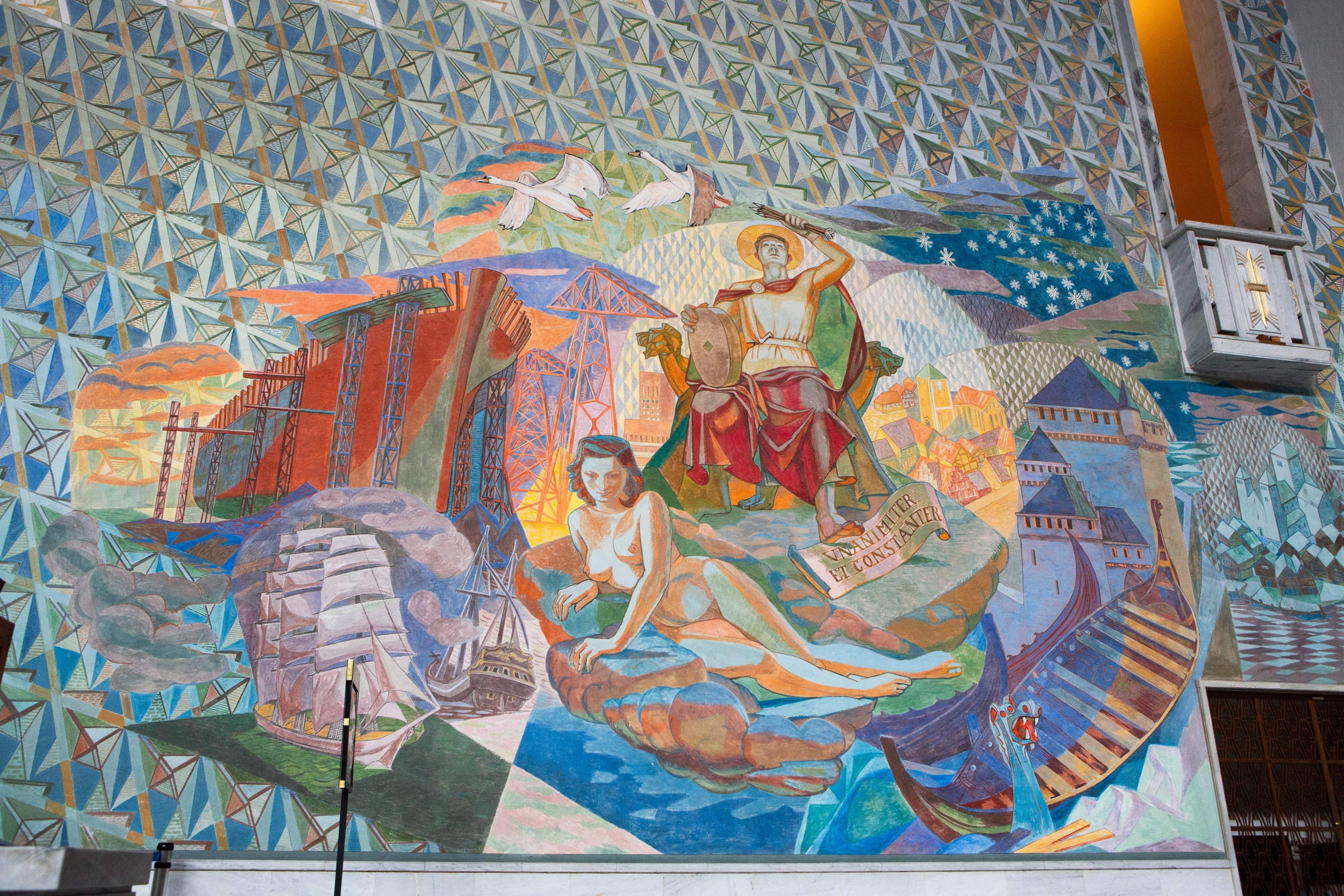 「正面に向かって右側の壁には、オスロの守護聖人である聖ハルヴァルドが描かれています。 彼はライオンの装飾が施された玉座に座り、3本の矢と石臼を手にしています。 伝説によると、盗みをはたらいたと訴えられた身重の女性を助けるために、彼は3本の矢を射られ命を落としました。 彼の遺体は石臼で重しをされ、ドラメンフィヨルドに投げ捨てられました。この犯罪を隠そうとする試みにもかかわらず、彼の遺体は水面に浮かび上がり、地元の人々によって発見されました。ハルヴァルドは聖人として宣言されました。それ以来、聖ハルヴァルドはオスロの守護聖人となっています。 彼の足元に刻まれた『Unanimiter et Constanter』という文字は、この都市のモットーです。これはラテン語で『団結と決意』を意味します。」これもアルフ・ロルフセンの作といい、またこのハルヴァルドは1043年に殺されたという。