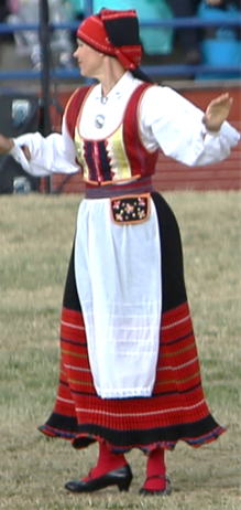 この最前列の赤い被り物とスカートの女性と、腕を交差する同地域の男性について