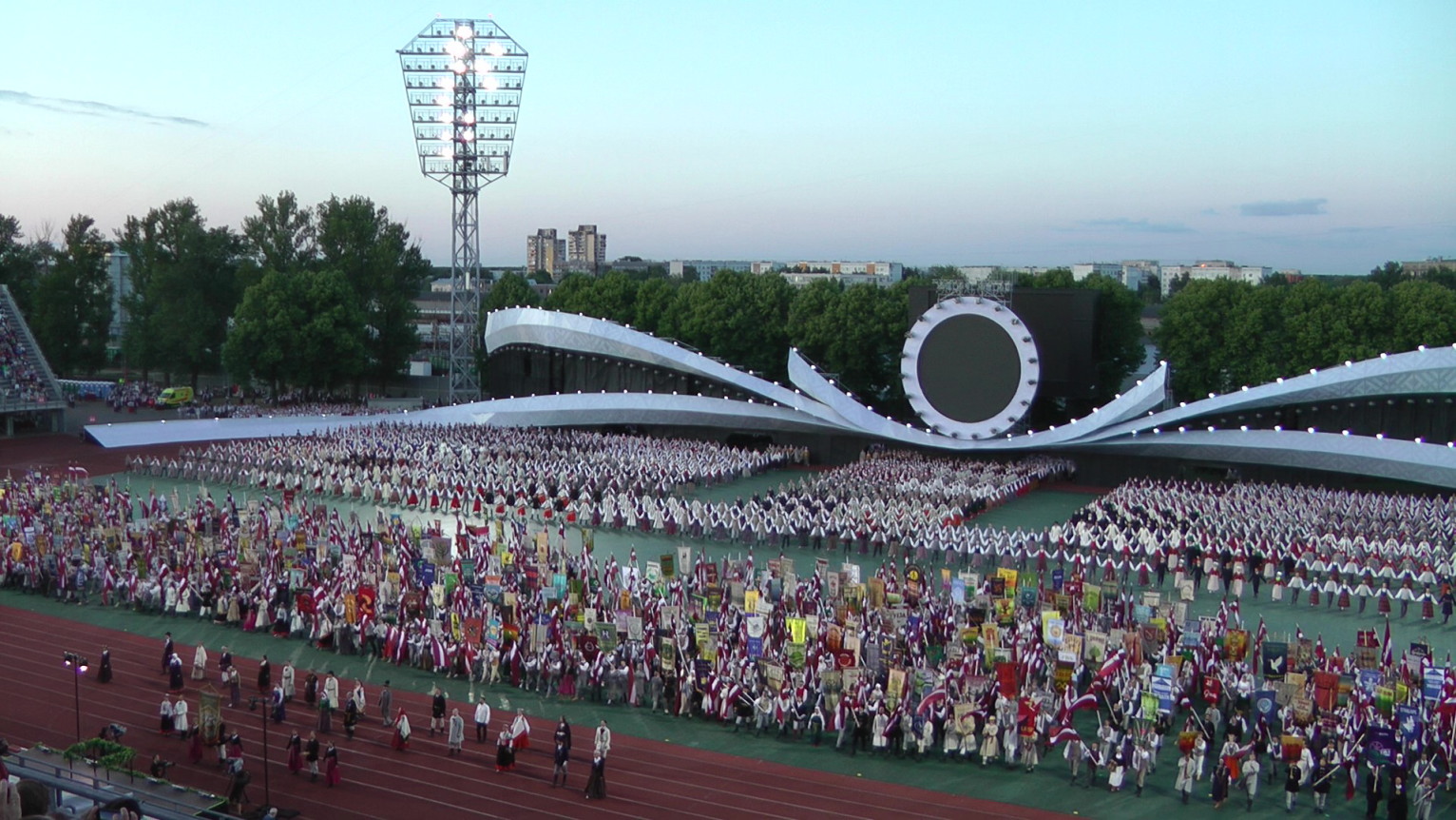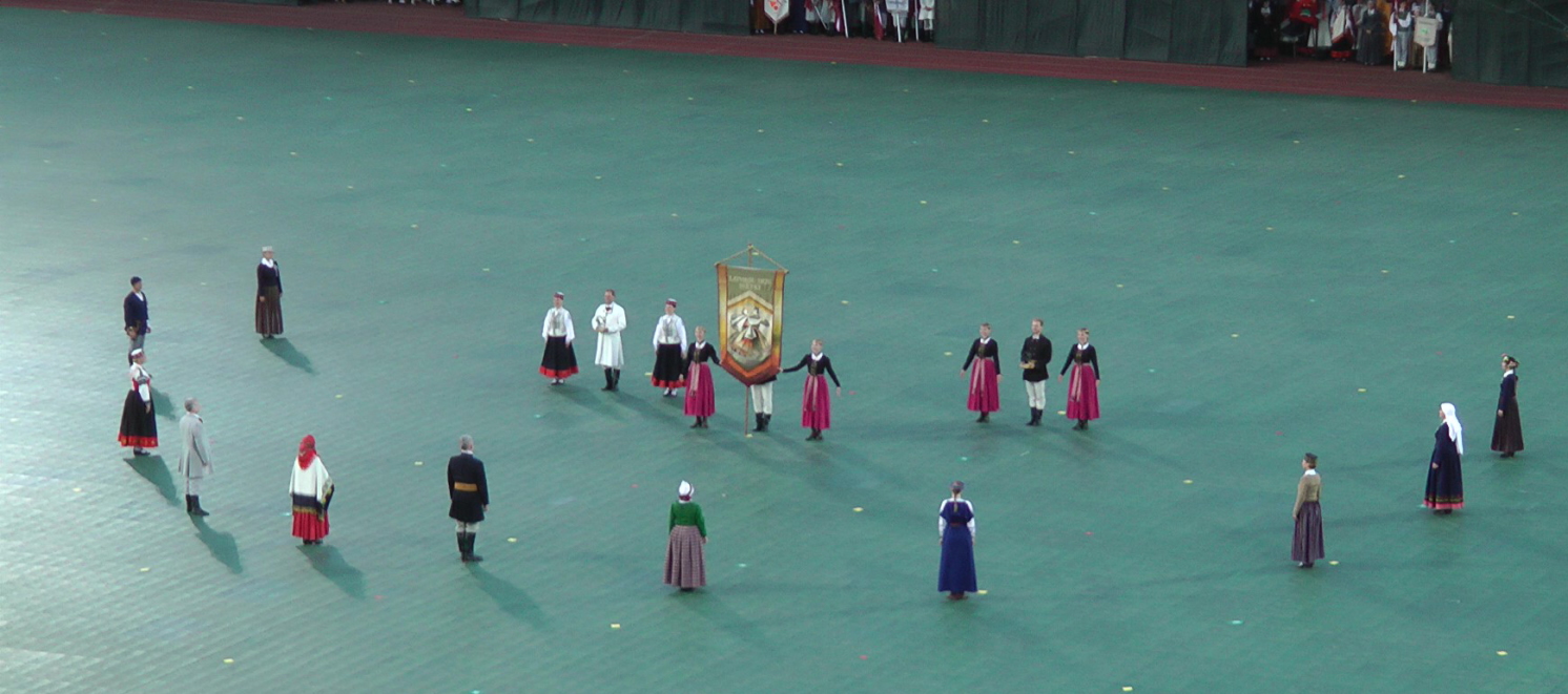 そして、この後、この祭典に参加する、海外在住ラトヴィア人の34グループを含む667のダンスグループ、17,543人のダンサーたち(この祭典のプログラムより。以下「プログラム」とする)のグループの代表がそれぞれのグループの旗や国旗を掲げて入場してきた。後には大勢のダンサーたちが続いた。