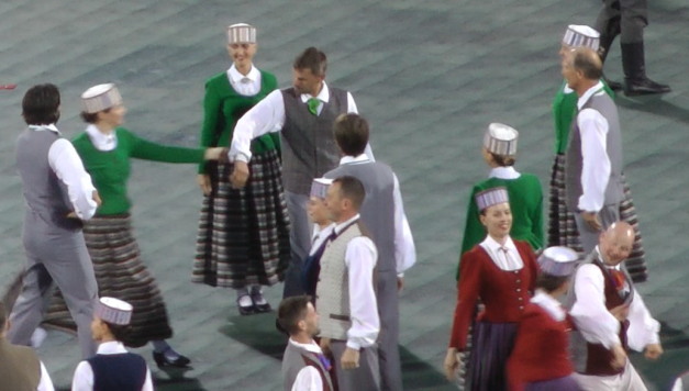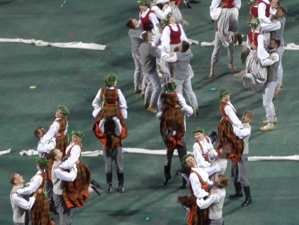 この「ES MĀCĒJU DANCI VEST」は馴染みやすいような曲で、有名なのか観客から手拍子が起きた。踊り手は126組のミドル・エイジ(中年)グループで、下の写真を御覧になるとわかると思うが、実に様々なラトヴィアの民族衣装を着て踊っている。私の知識では、特定の地域のものではなく、様々な地域の衣装である。