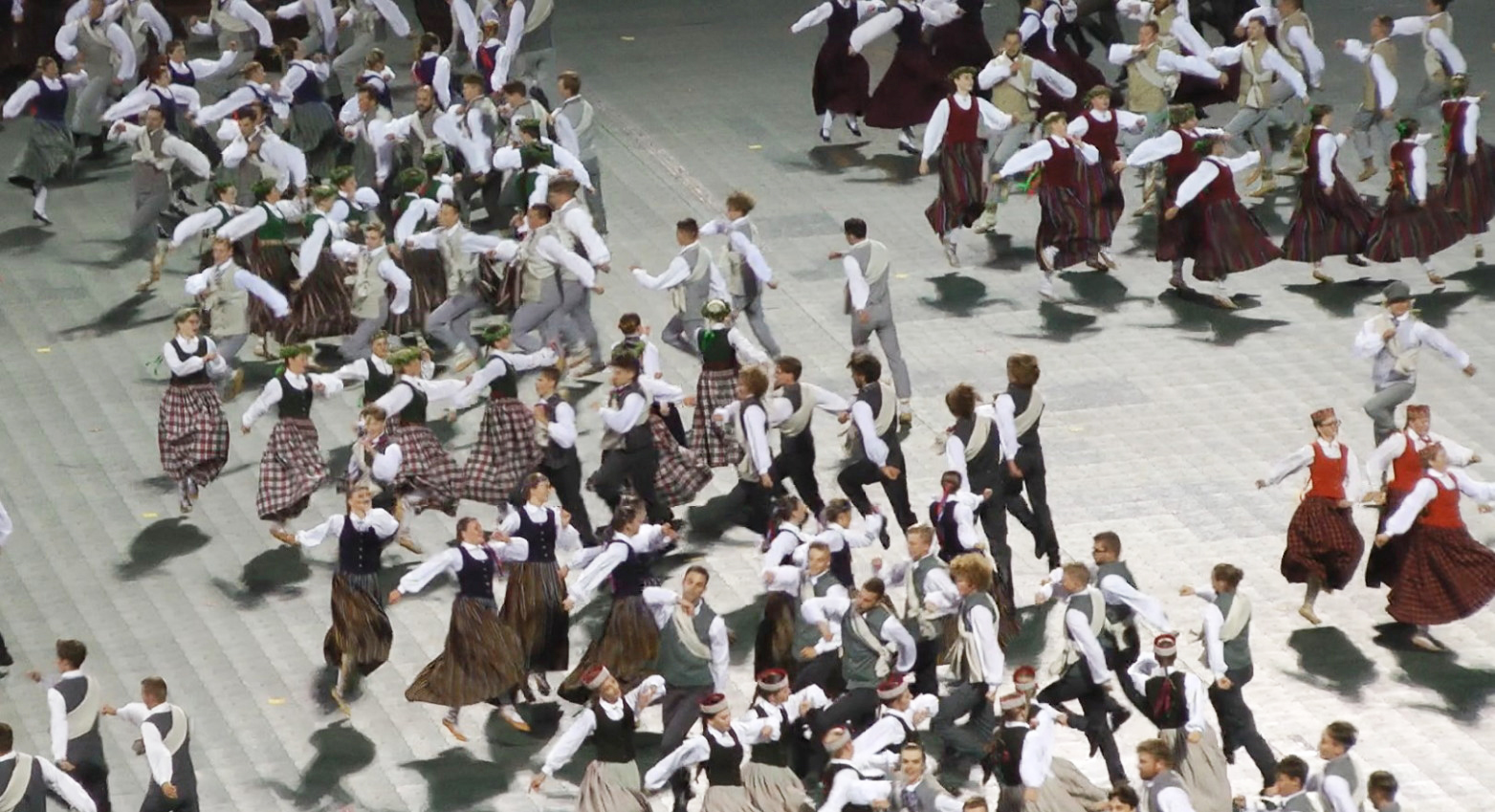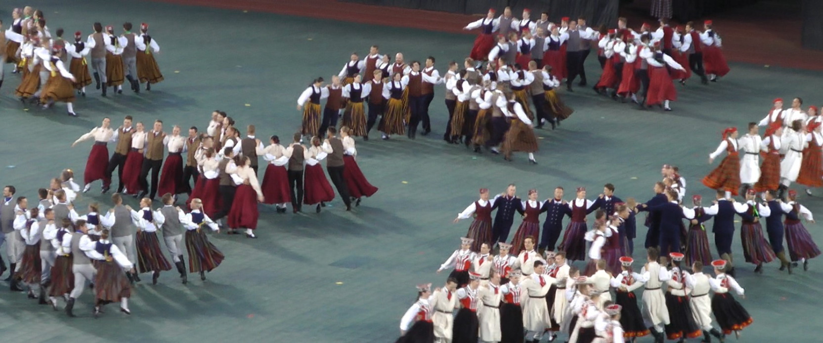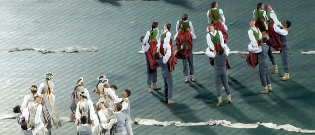 いずれもビデオからのフレーム(この後の写真の多くも同フレームより)。プログラムによると青年の37ダンスグループが演じた。「リガ」に関連するダンスだが、皆の着ている民族衣装はリガのものだけではなく、ラトヴィア全域のものである。例えばすぐ上の右下の人々はクルゼメの衣装。