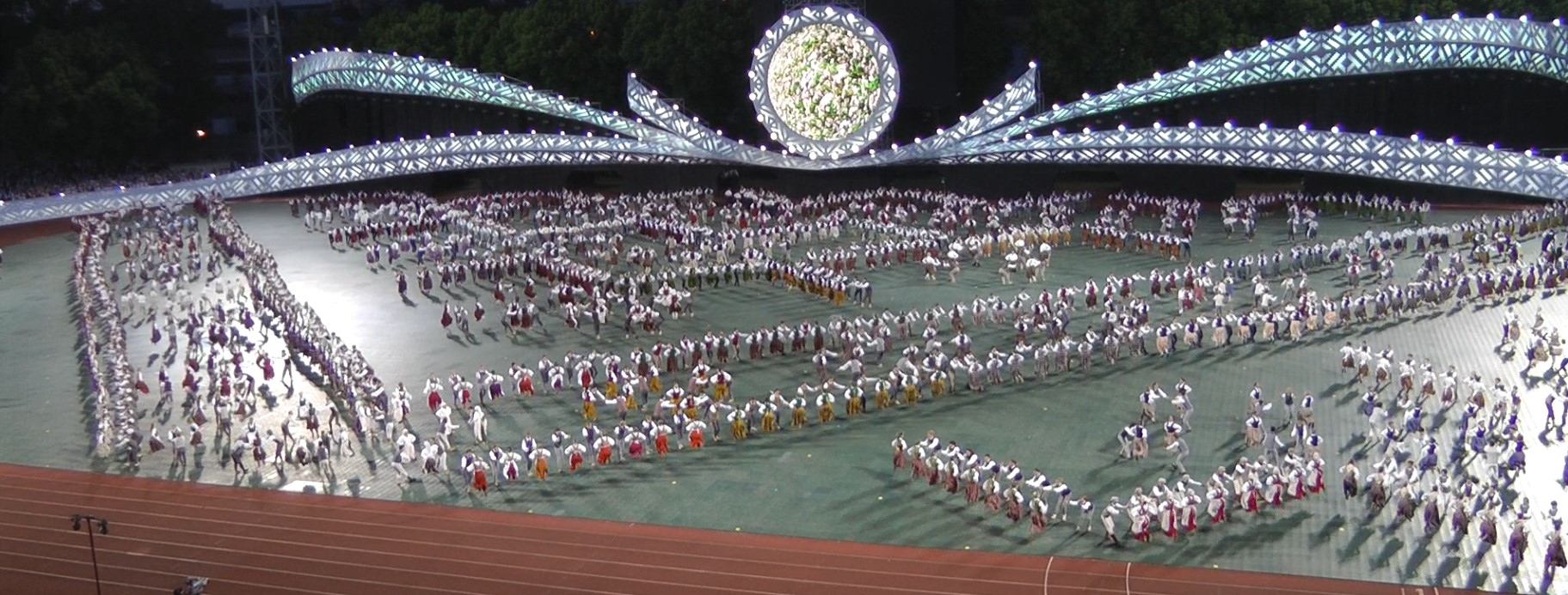 ミドル世代の126組が踊り、最後はこのような形で終わった。左手前に縦隊で並んでいるのは、次の演目に出演するため待機している人々。