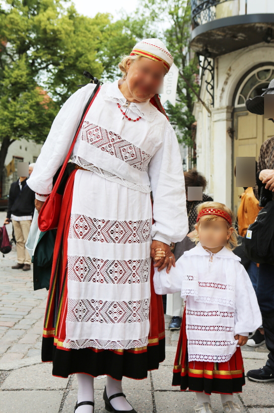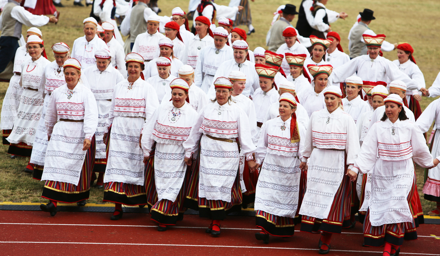 踊りの祭典より。ヒューマー島の2つの地域の人々が一緒に退場しているところ。向かって左から正面にかけての白・金色・赤の被り物をしている人々がPühalepa、右奥の上に広がった赤、金色、緑の被り物をしている人々がReigiの人々。Eesti Rahvarõivad(エストニアの民族衣装)という、ウェブサイトのRAHVARŎIVAD→Otsi kataloogist(検索カタログ)→Saared(諸島)→PühalepaとReigi→女性のマーク→Kõik(全て)→OTSI RŎIVAID(検索反応)をクリックして現れる衣装の諸部分の写真を見て、Tanu(被り物)の独特の形、ブラウスの胸元の刺繍模様、スカートの柄などより。