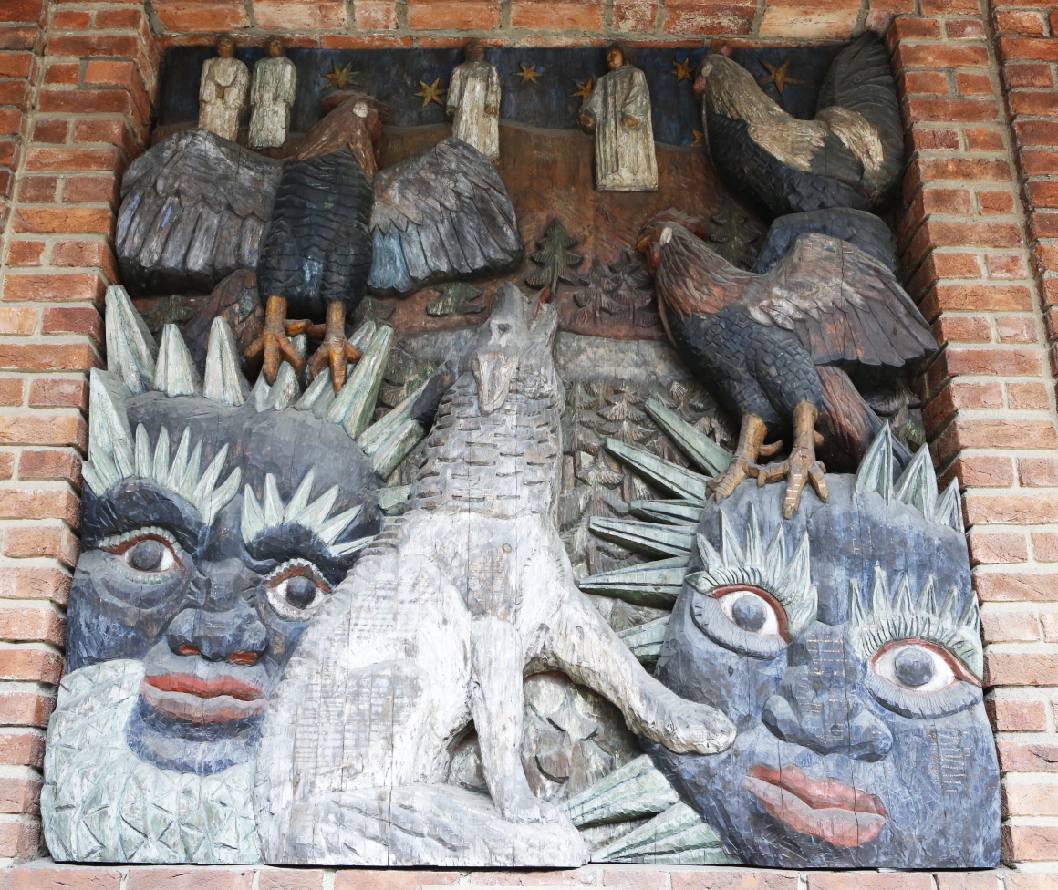 説明パネルには「恐ろしい犬ガルムが地下の世界(死者の国)への入口を守っている。そして古い世界のラグナレク(至高権力の運命。神々の黄昏)、崩壊を予告している。3羽の鶏が鳴き、起ころうとしている戦いについて予告している。それらはアース神のところでオーディンの戦士たちを目覚めさす金色の鶏冠のグリンカムビ、地下世界の煤で赤茶けた鶏、巨人世界の赤い鶏フィアラルである。大勢の神々、巨人たち、悪者たちが戦場ヴィーグリーズ(世界で最も広い)またはオースコープニル(まだ創造されていないものの一つ)を満たすであろう。太陽は消滅させられ、狼フェンリルはオーディンを貪り食い、トールとフレイは戦いで死ぬであろう。」とある。