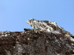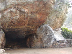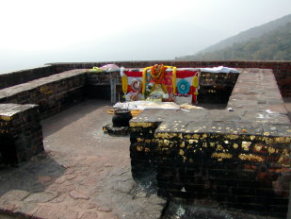 山の名は、頂上の岩が鷲の頭と翼を広げた形に見えるところから。見えますか ? 右は頂上のすぐ近くでゴータマが説法したとされる場所。「法華経」などがここで説かれたという。